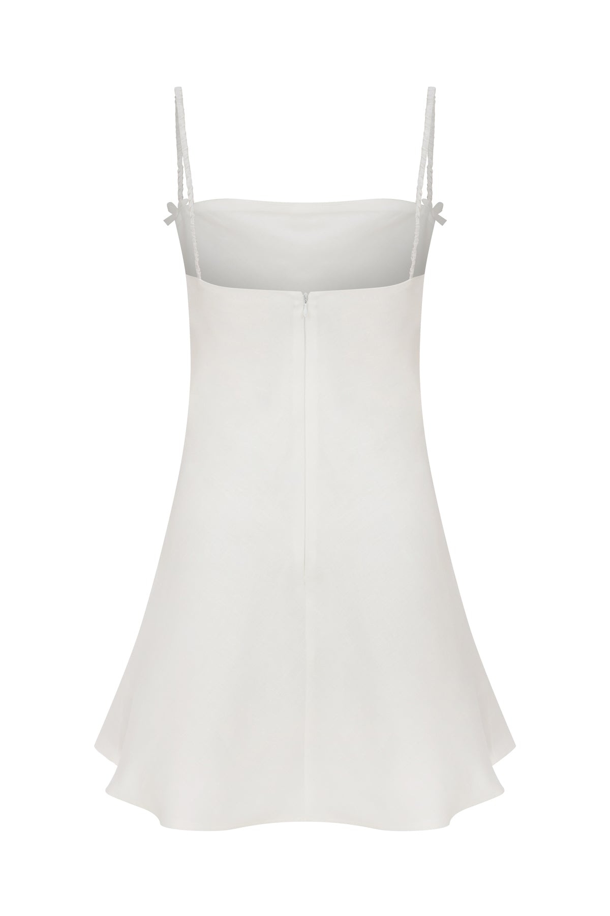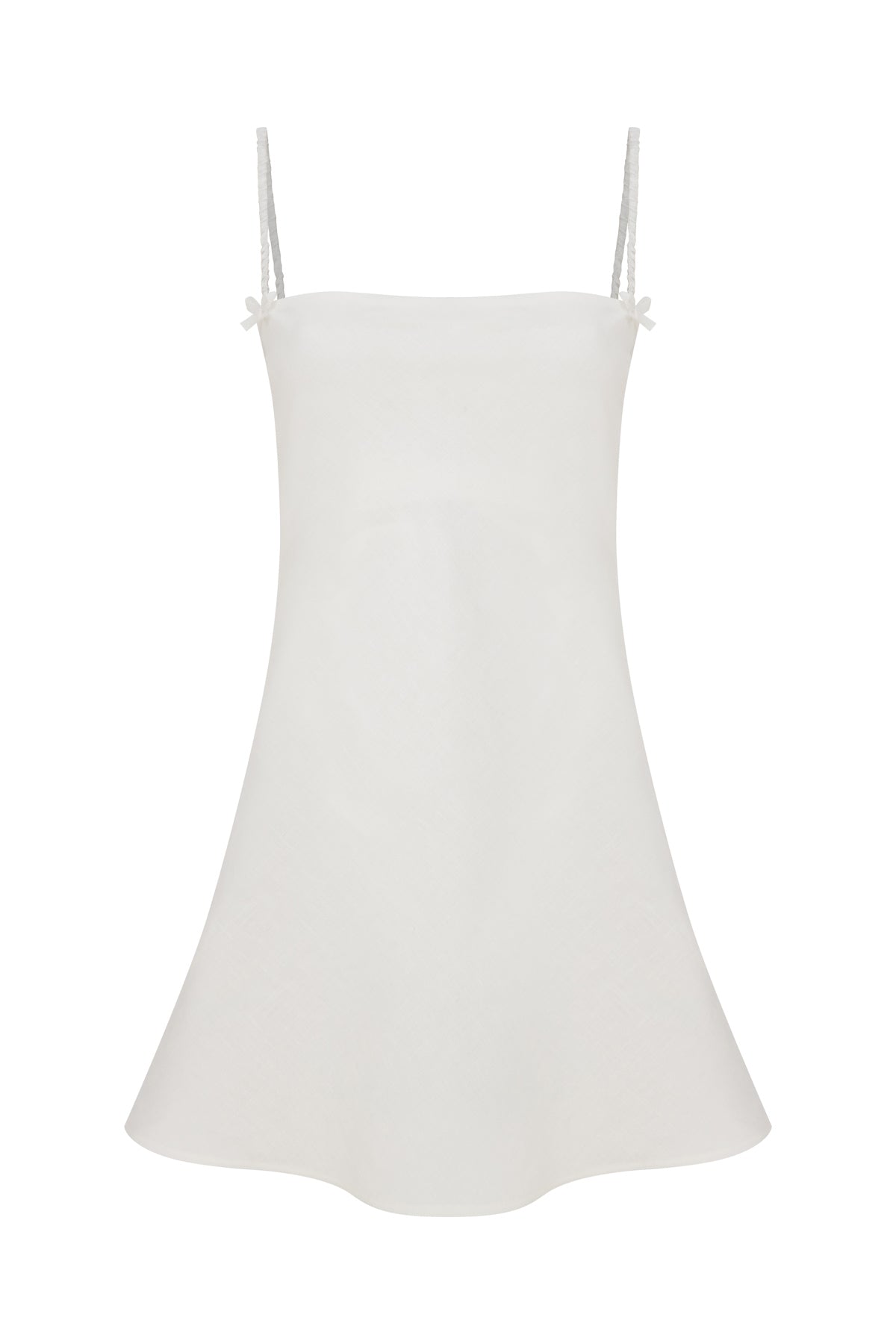 Ürün Açıklaması:Organze kaplamalı ince lastik askılı,fiyonk aksesuar detaylı, sırt kısmı gizli fermuarlı, cotton vual astarlı 100% keten mini elbise
