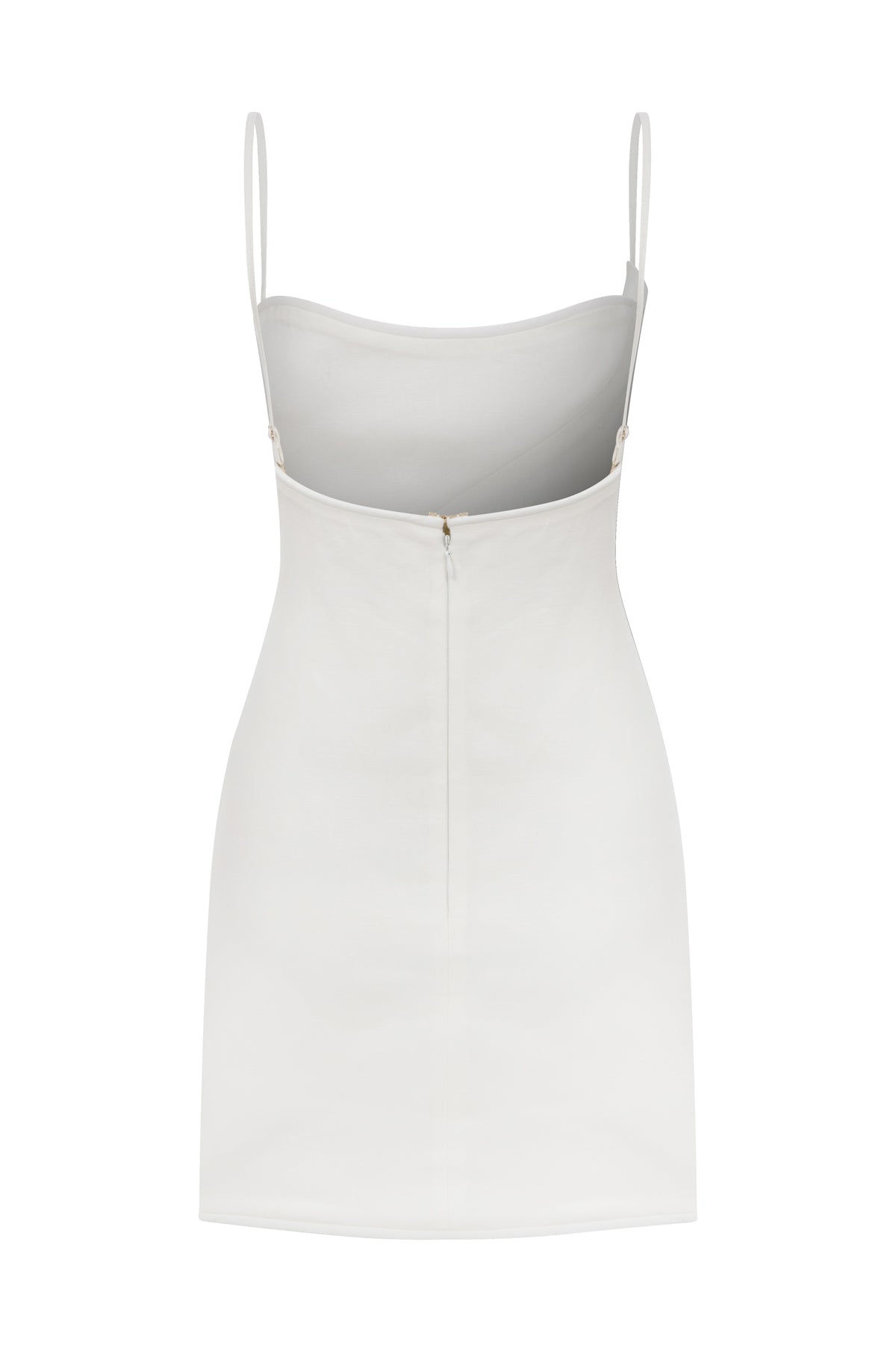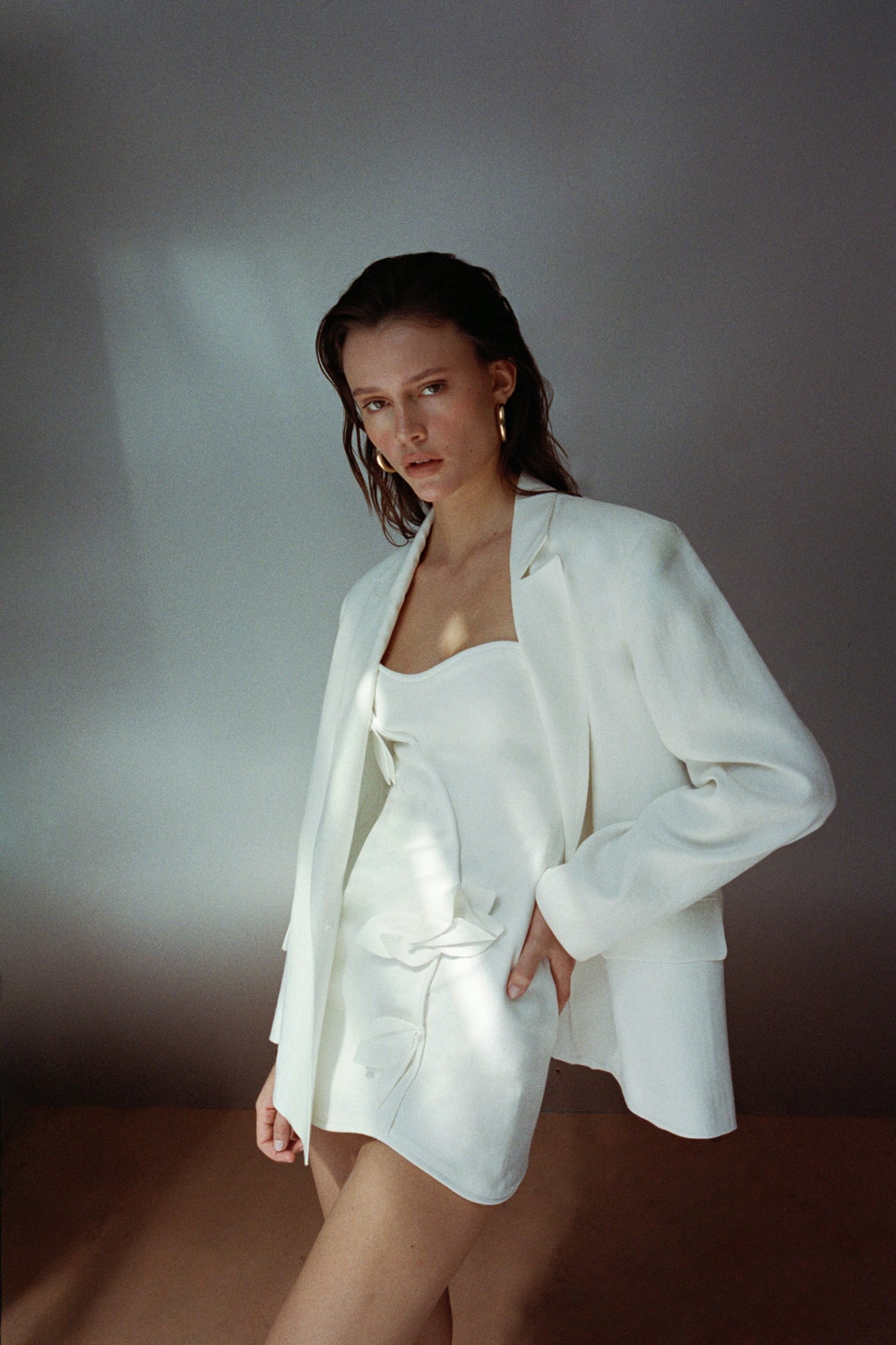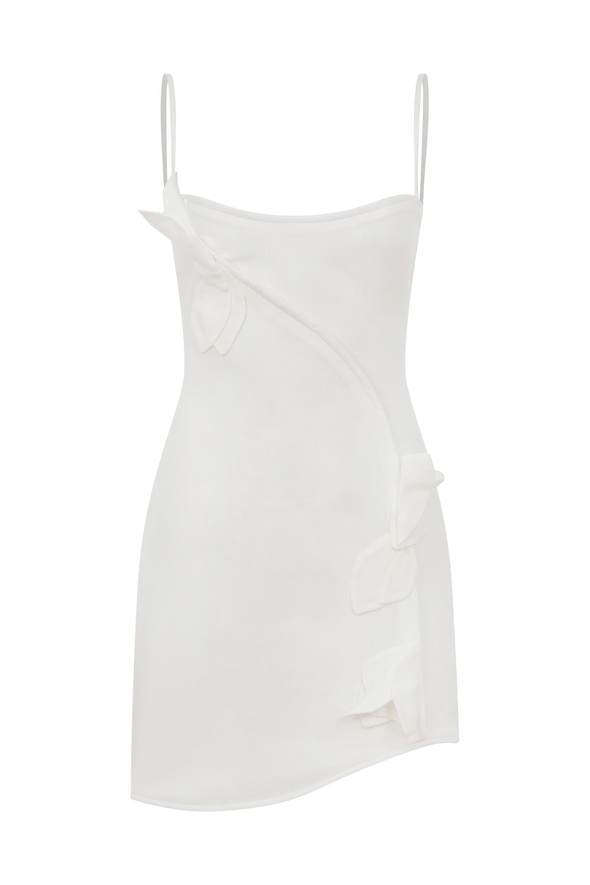 Ürün Açıklaması: Takılıp çıkarılabilir (demonte) ve ayarlanabilir ince askılı, üç boyutlu biye ve el işçiliği çiçek aksesuarlı, sırt kısmı gizli fermuar ve agraf kapamalı, cotton vual astarlı 100% keten asimetrik mini elbise