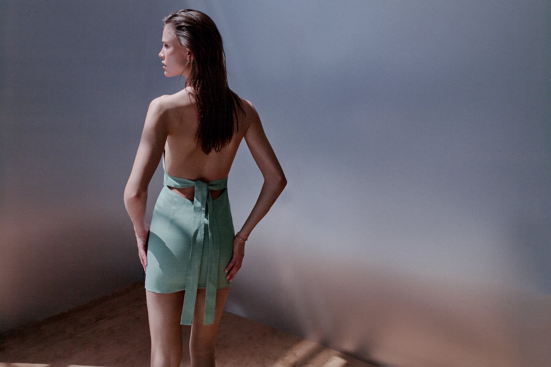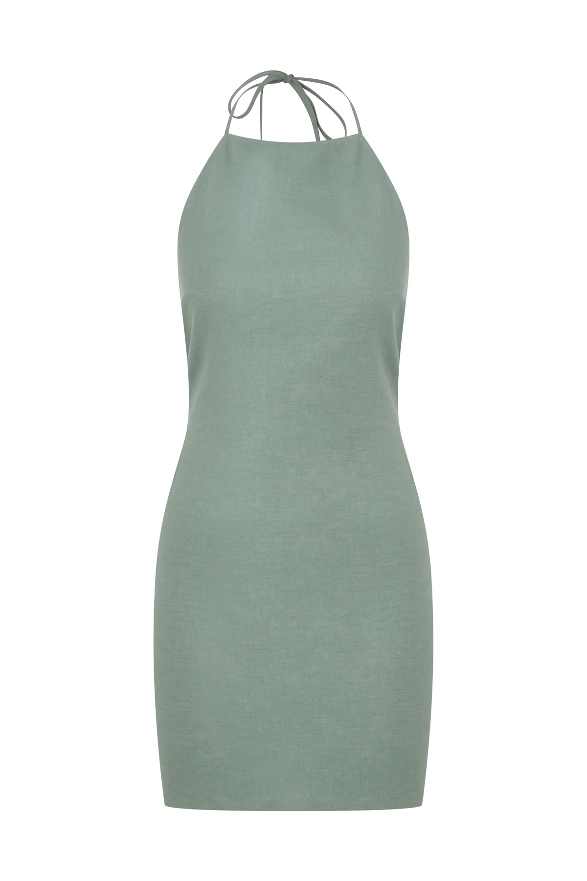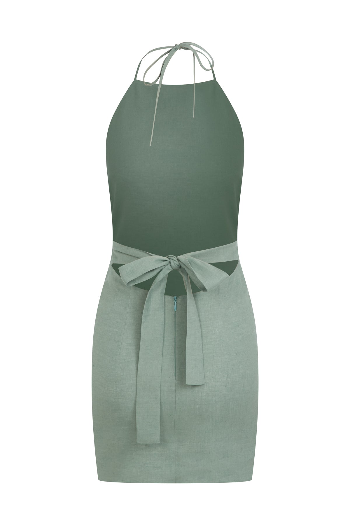 Ürün Açıklaması: Boyundan ince, sırt kısmında kalın bağcık kapamalı, belde gizli fermuarlı cotton vual astarlı 100% keten mini elbise
