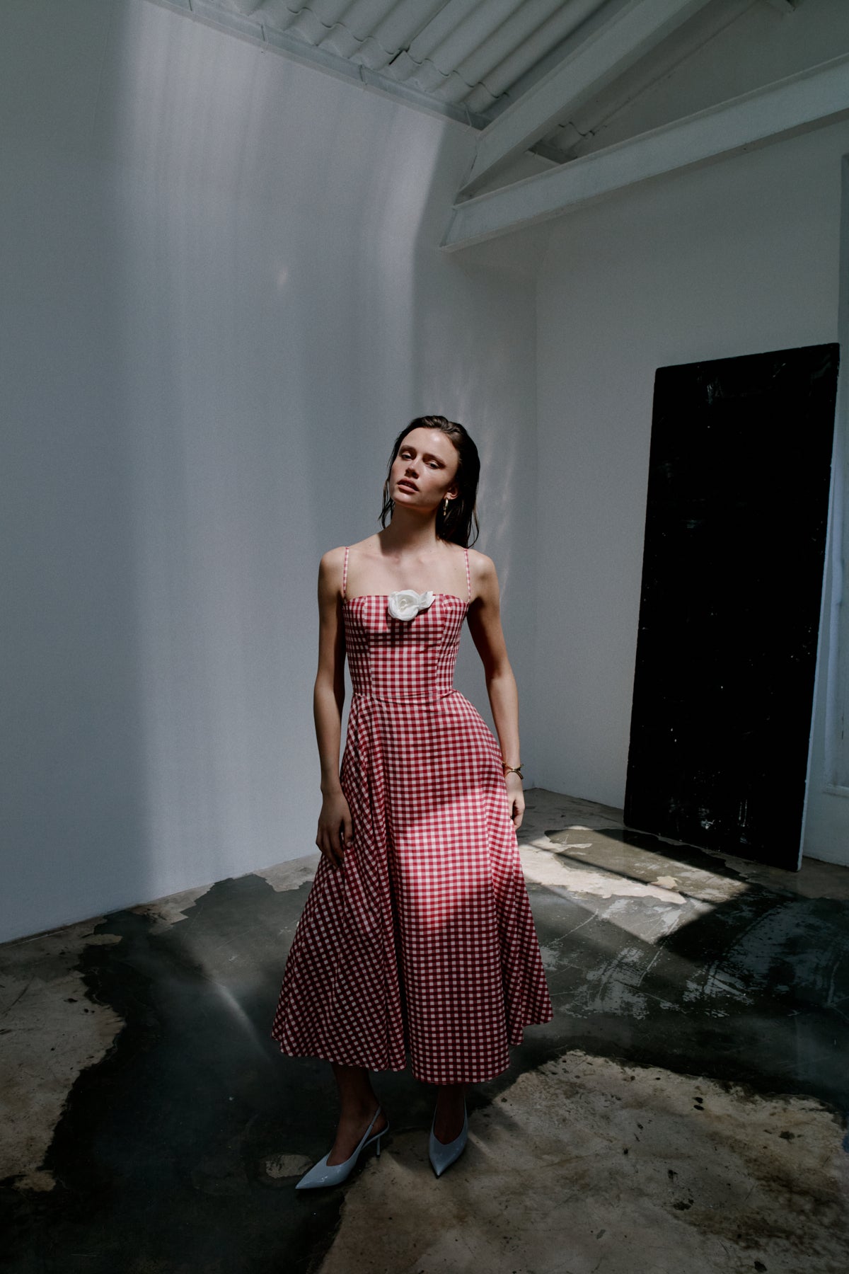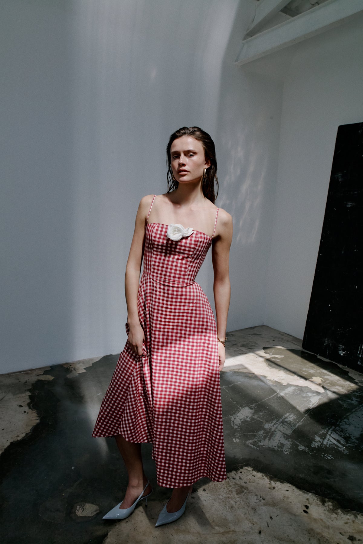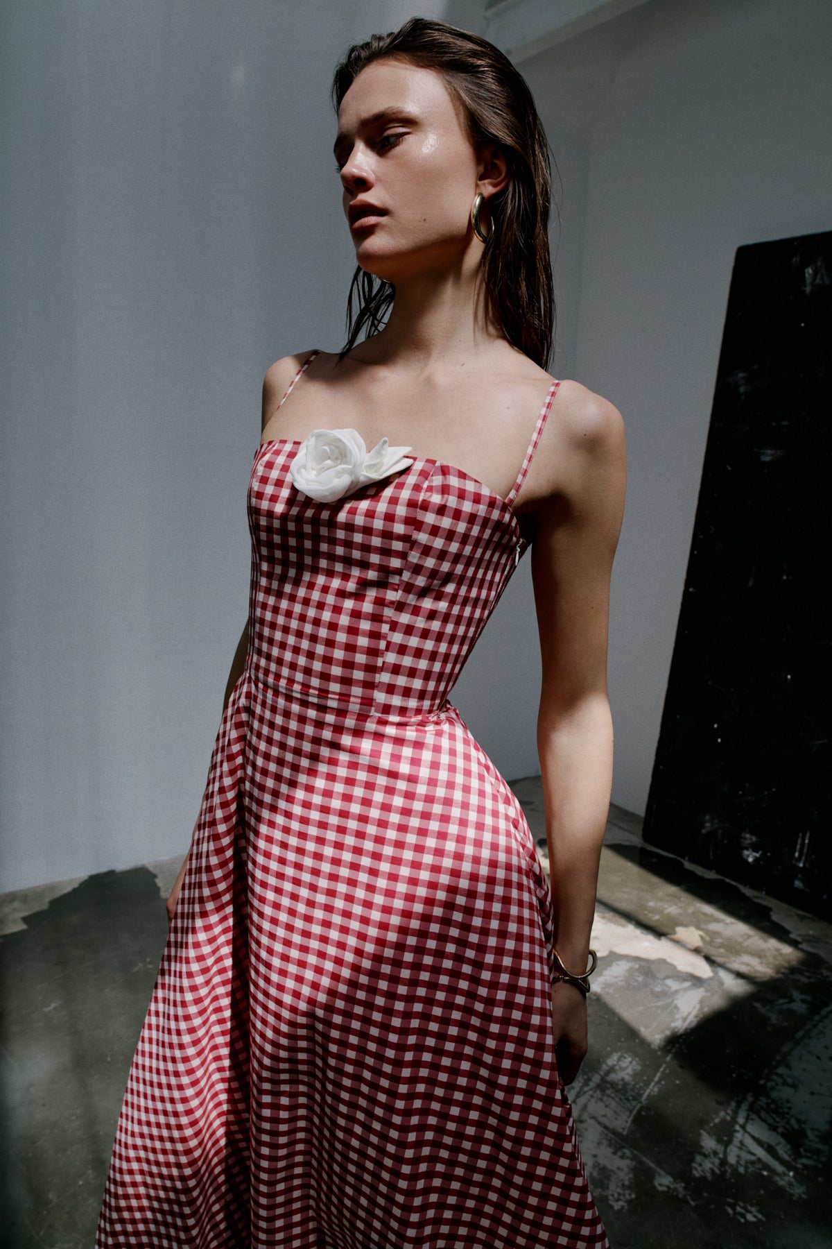 Ürün Açıklaması: Takılıp çıkarılabilir (demonte) ve ayarlanabilir ince askılı, el işçiliği demonte çiçek aksesuarlı kare yaka, sırt kısmı gipe ve lastikli, yandan gizli fermuarlı ve cepli uzun elbise