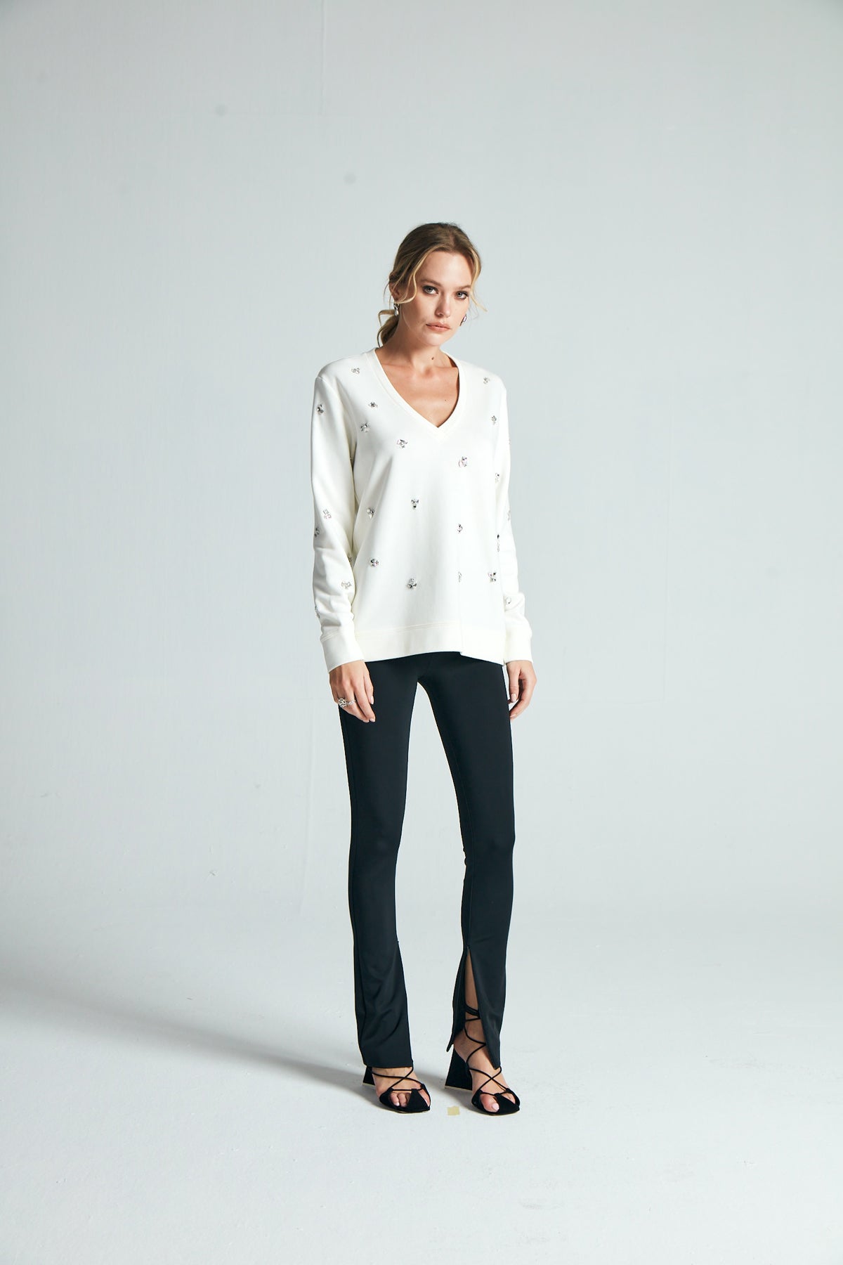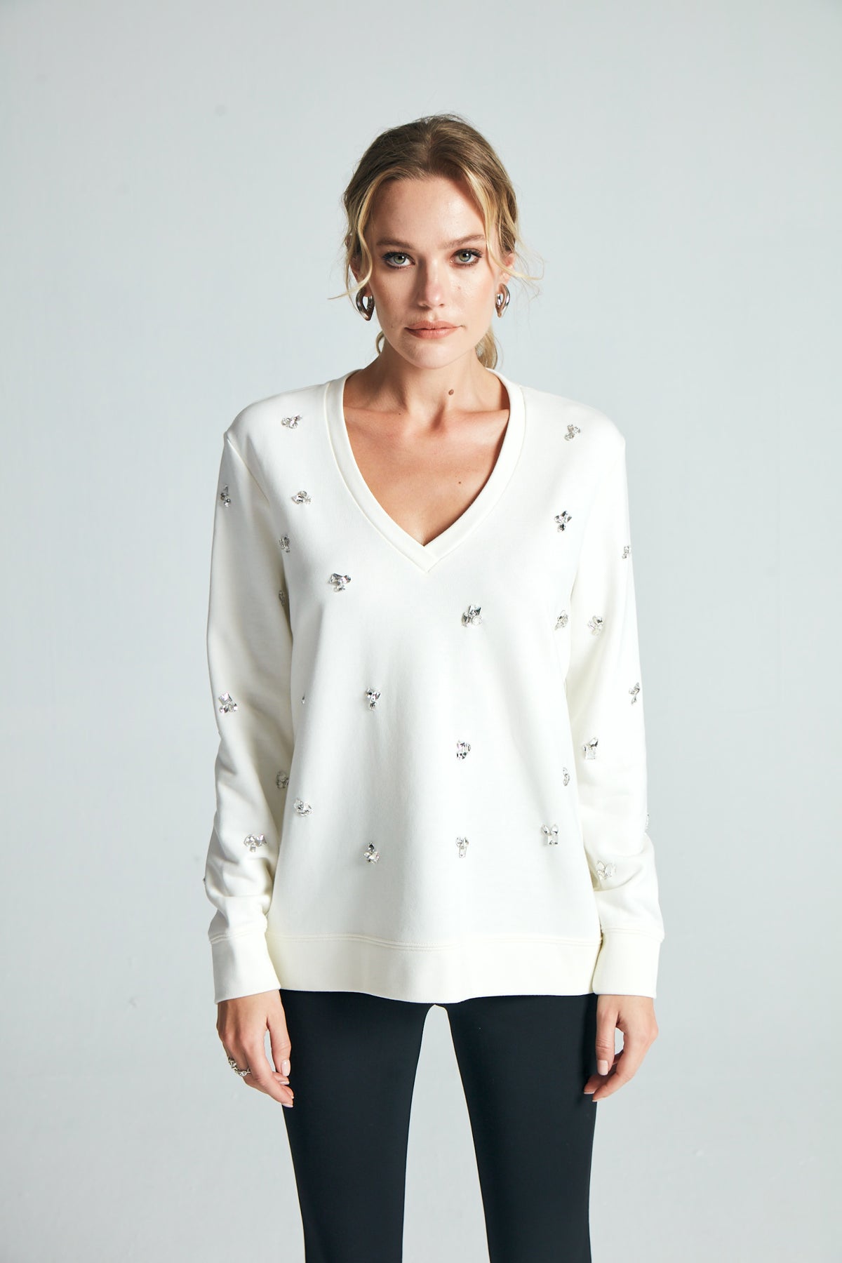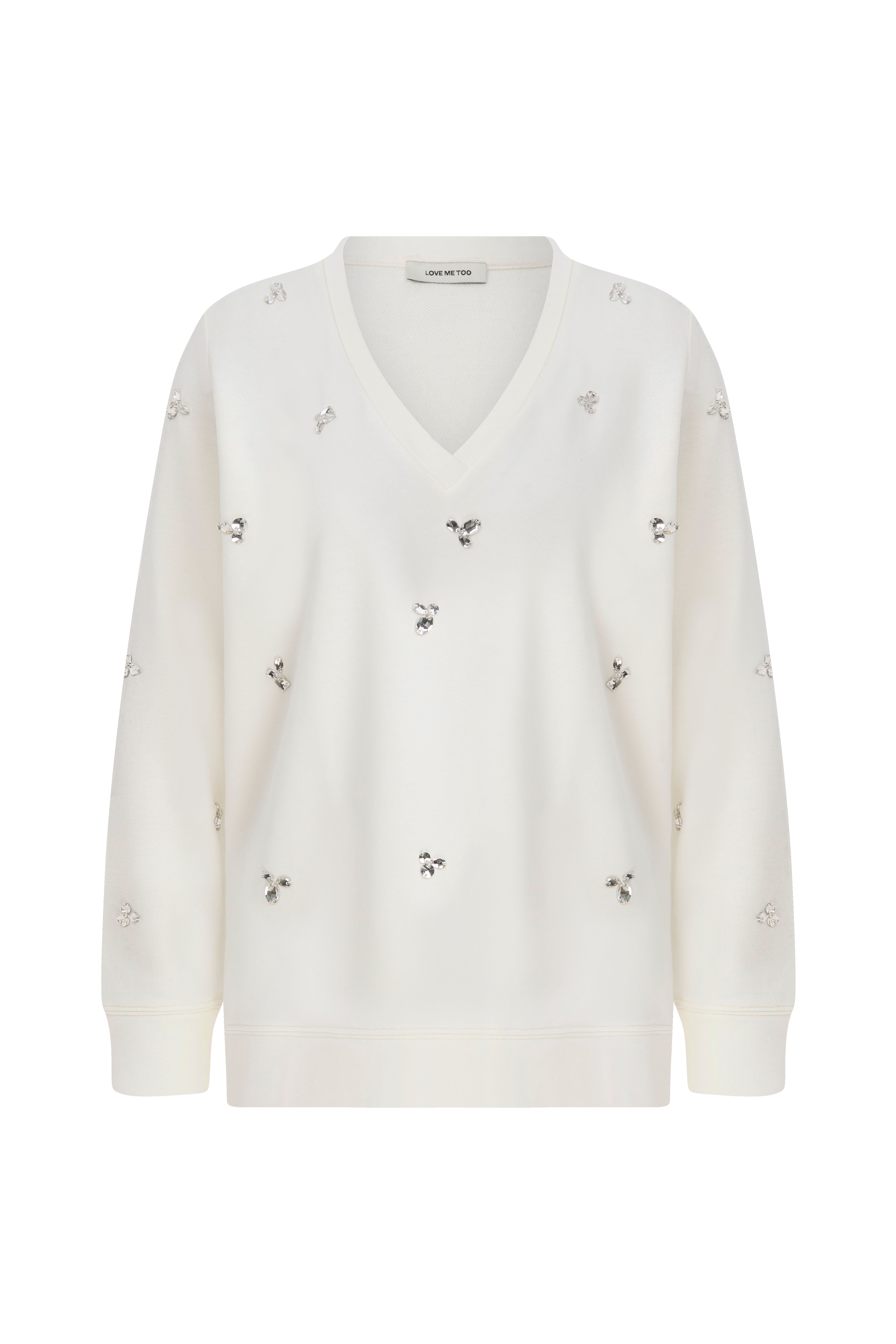 Ürün Açıklaması: Kristal taşlı aksesuar işlemeli V yaka sweatshirt Kumaş Bilgisi: %100 Cotton Bakım Önerileri: 30º Max Yıkama Tersten yıkayın Ağartıcı kullanmayın Tamburlu kurutma yapmayın Orta ısıda ütüleme yapın Kuru temizleme yapılabilir.