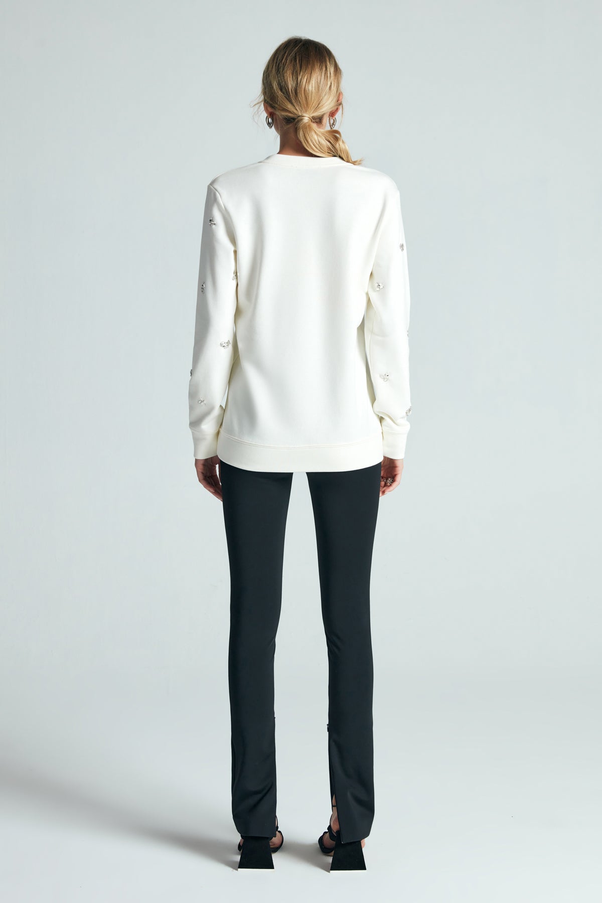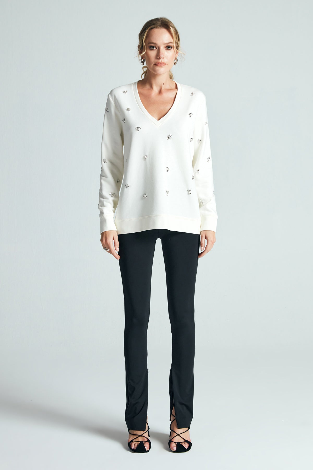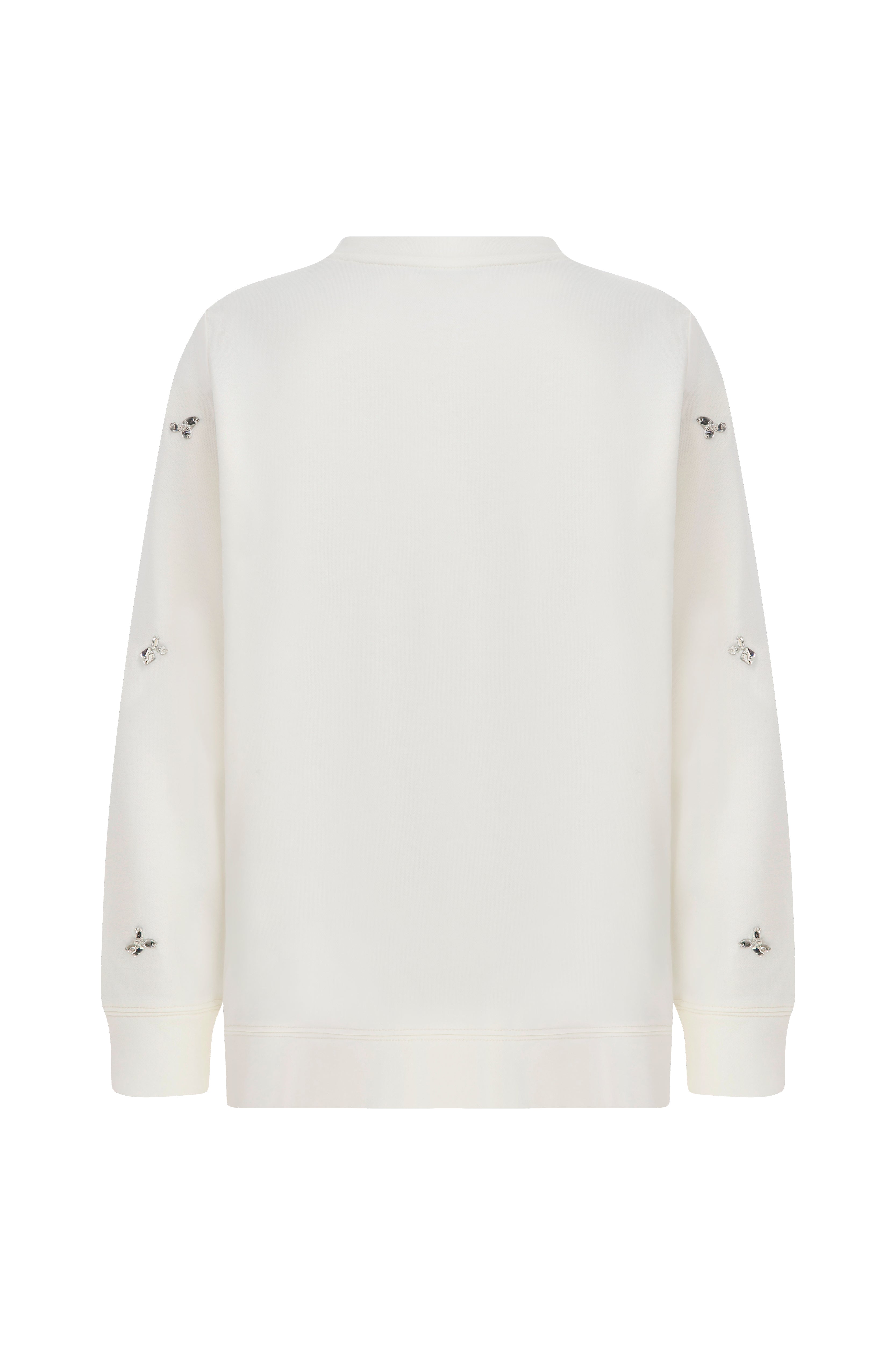 Ürün Açıklaması: Kristal taşlı aksesuar işlemeli V yaka sweatshirt Kumaş Bilgisi: %100 Cotton Bakım Önerileri: 30º Max Yıkama Tersten yıkayın Ağartıcı kullanmayın Tamburlu kurutma yapmayın Orta ısıda ütüleme yapın Kuru temizleme yapılabilir.