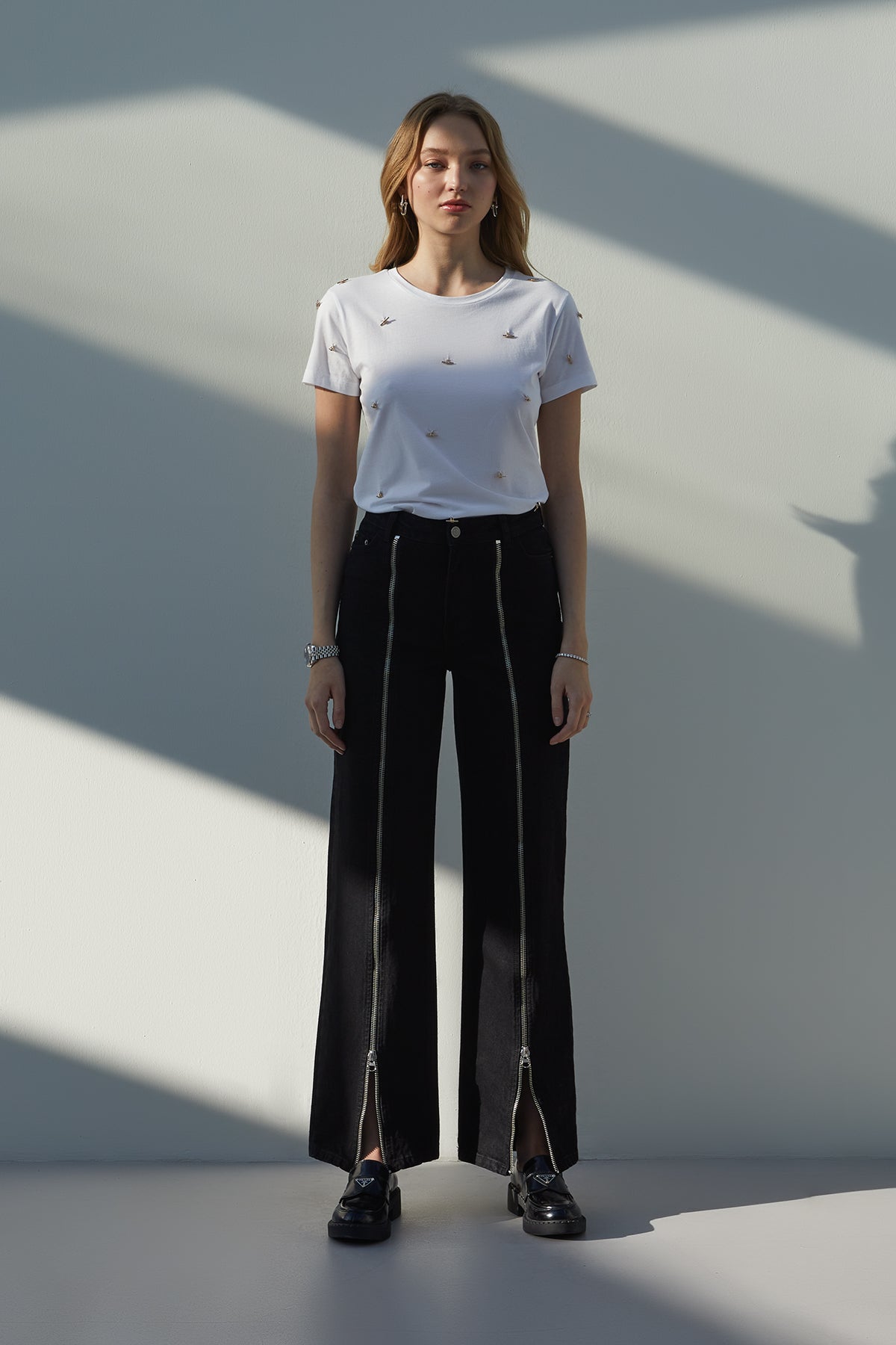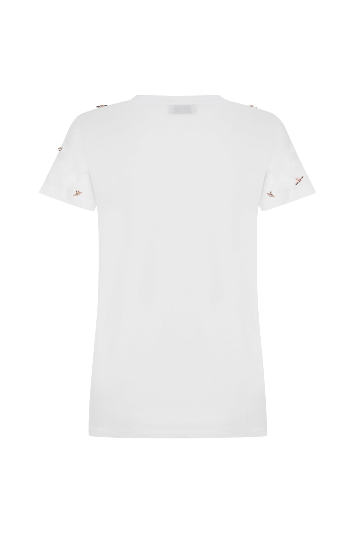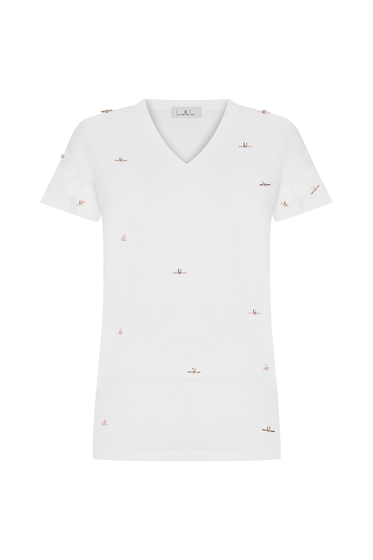 Ürün Açıklaması: Gold renk aksesuar detaylı V yaka, kısa kollu t-shirt Kumaş Bilgisi: %100 Cotton Bakım Önerileri: 30º Max Yıkama Tersten yıkayın Ağartıcı kullanmayın Tamburlu kurutma yapmayın Düşük ısıda ütüleme yapın Kuru temizleme yapılabilir.