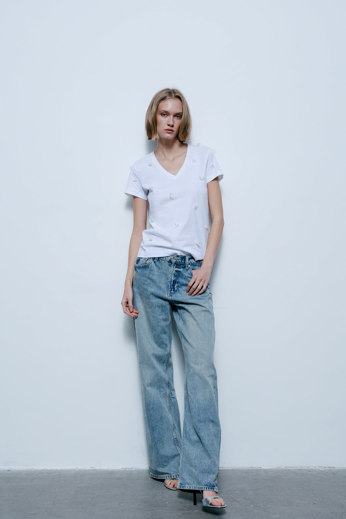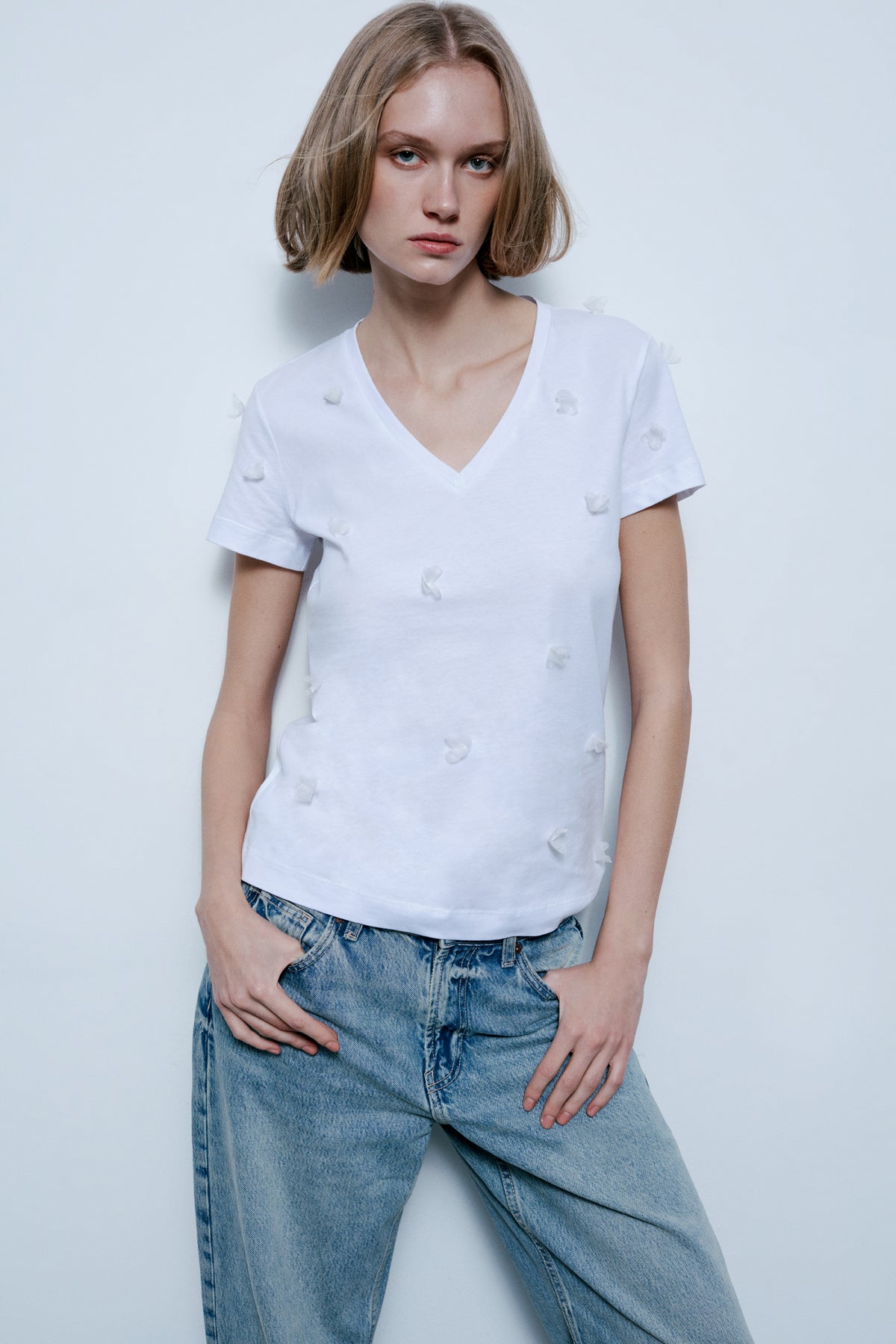 Ürün Açıklaması: Organze el yapımı çiçek aksesuar detaylı, el işçiliği V yaka t-shirt Kumaş Bilgisi: %100 Cotton Bakım Önerileri: 30º Max Yıkama Tersten yıkayın Ağartıcı kullanmayın Tamburlu kurutma yapmayın Orta ısıda ütüleme yapın