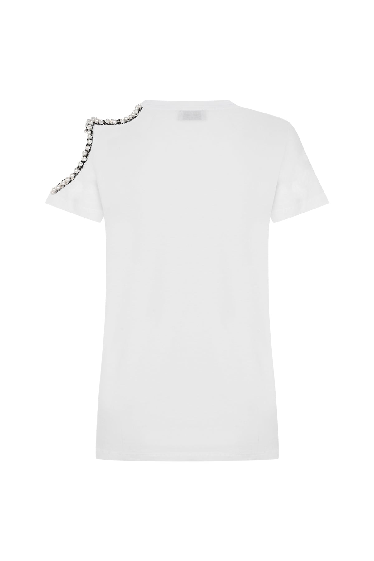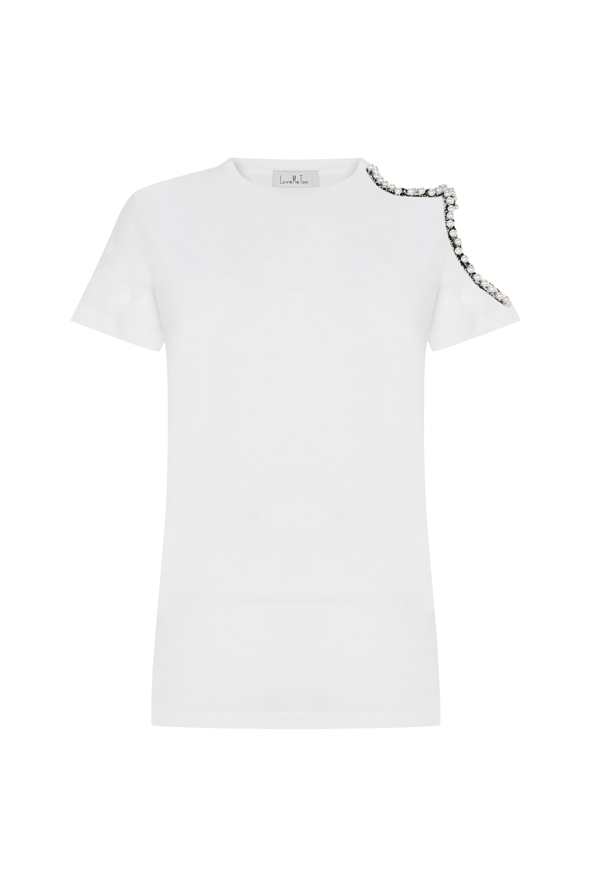 Ürün Açıklaması:Tek omuz kısmı dekolteli incili aksesuar detaylı bisiklet yaka tshirt Kumaş Bilgisi: 100% Cotton Bakım Önerileri: 30º Max Yıkama Tersten yıkayın Ağartıcı kullanmayın Tamburlu kurutma yapmayın Düşük ısıda ütüleme yapın Kuru temizleme yapılabilir.