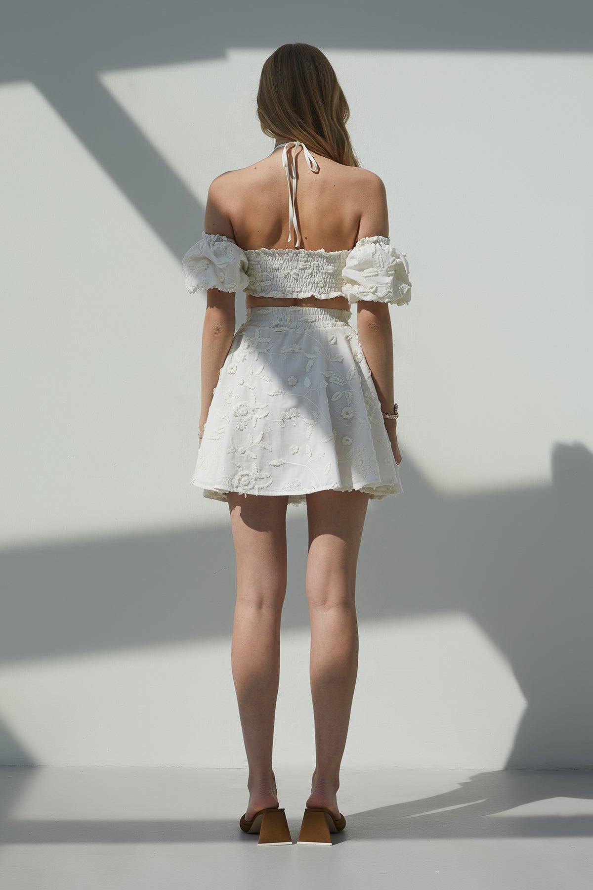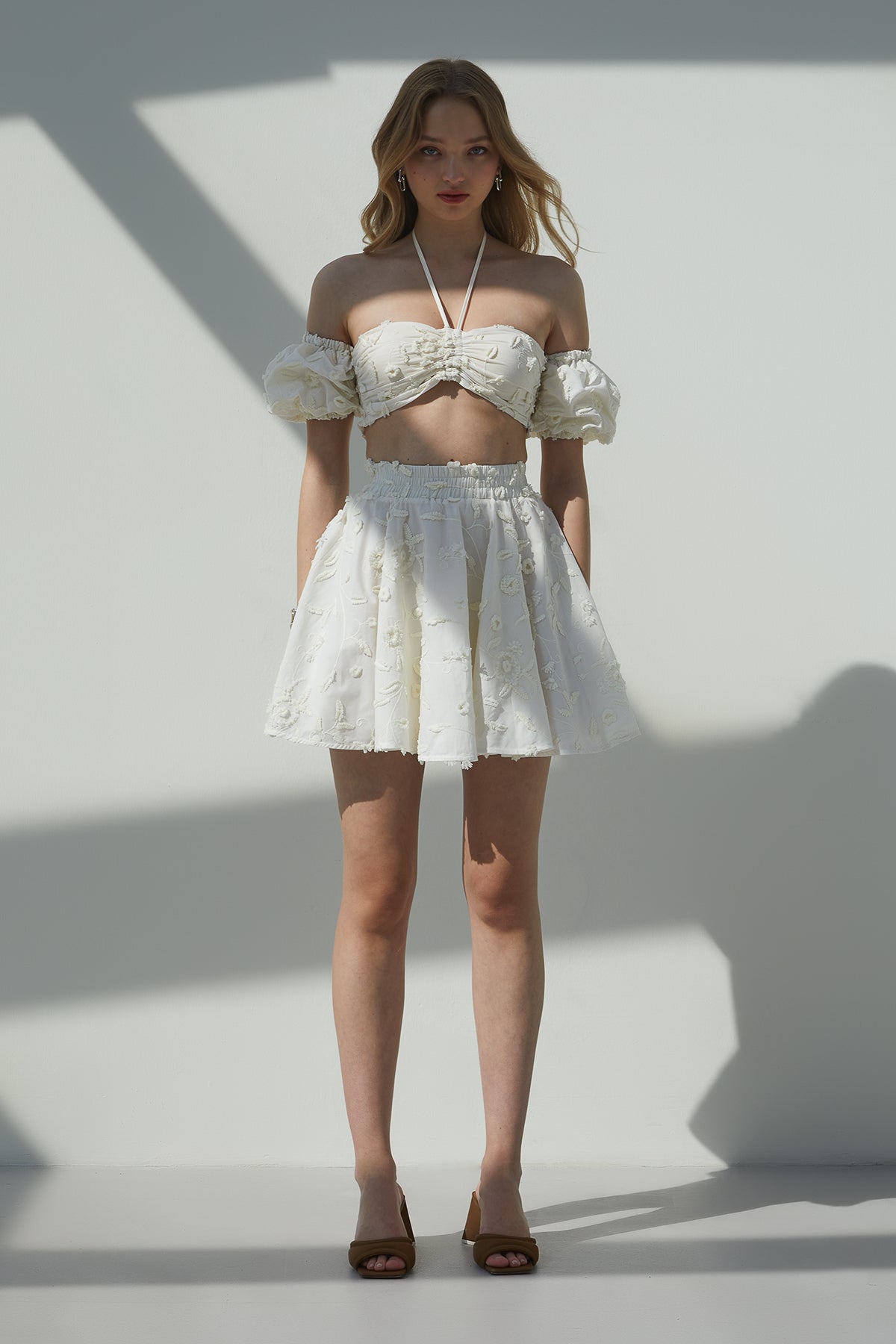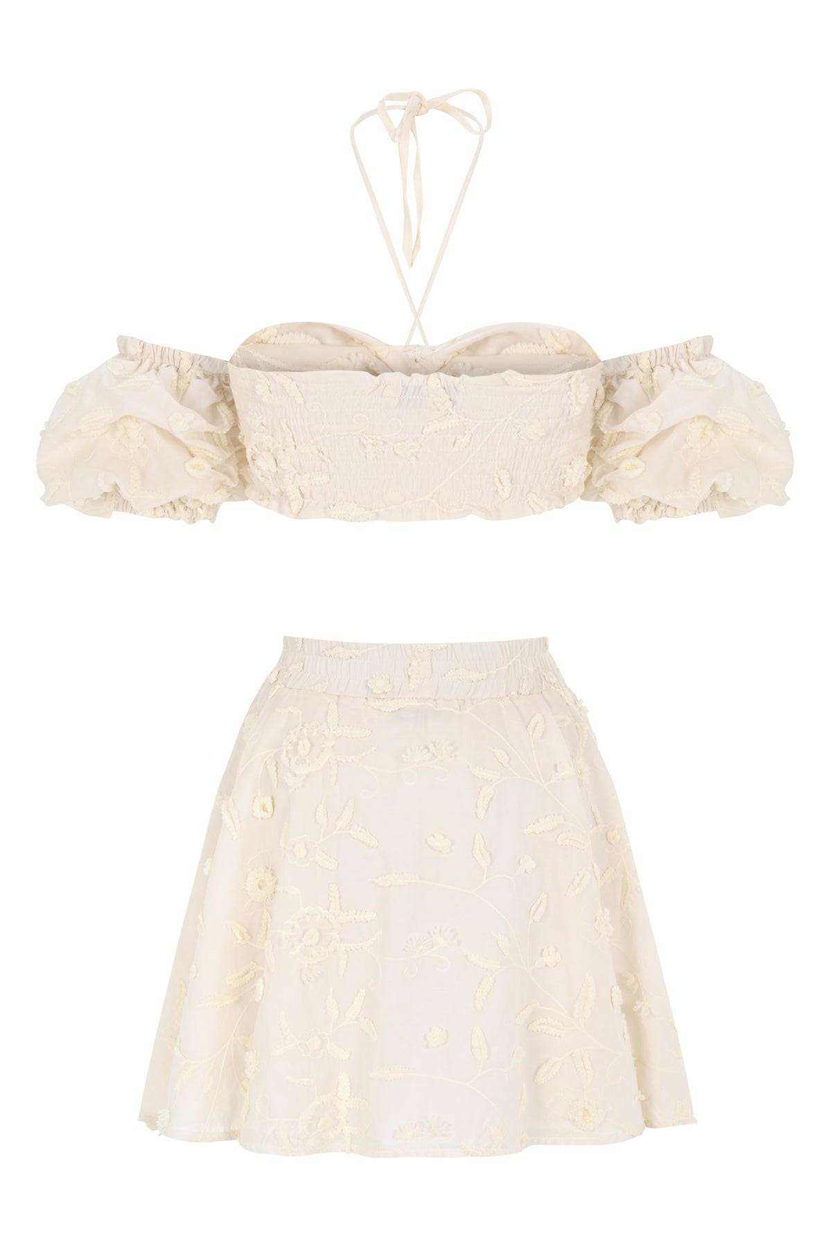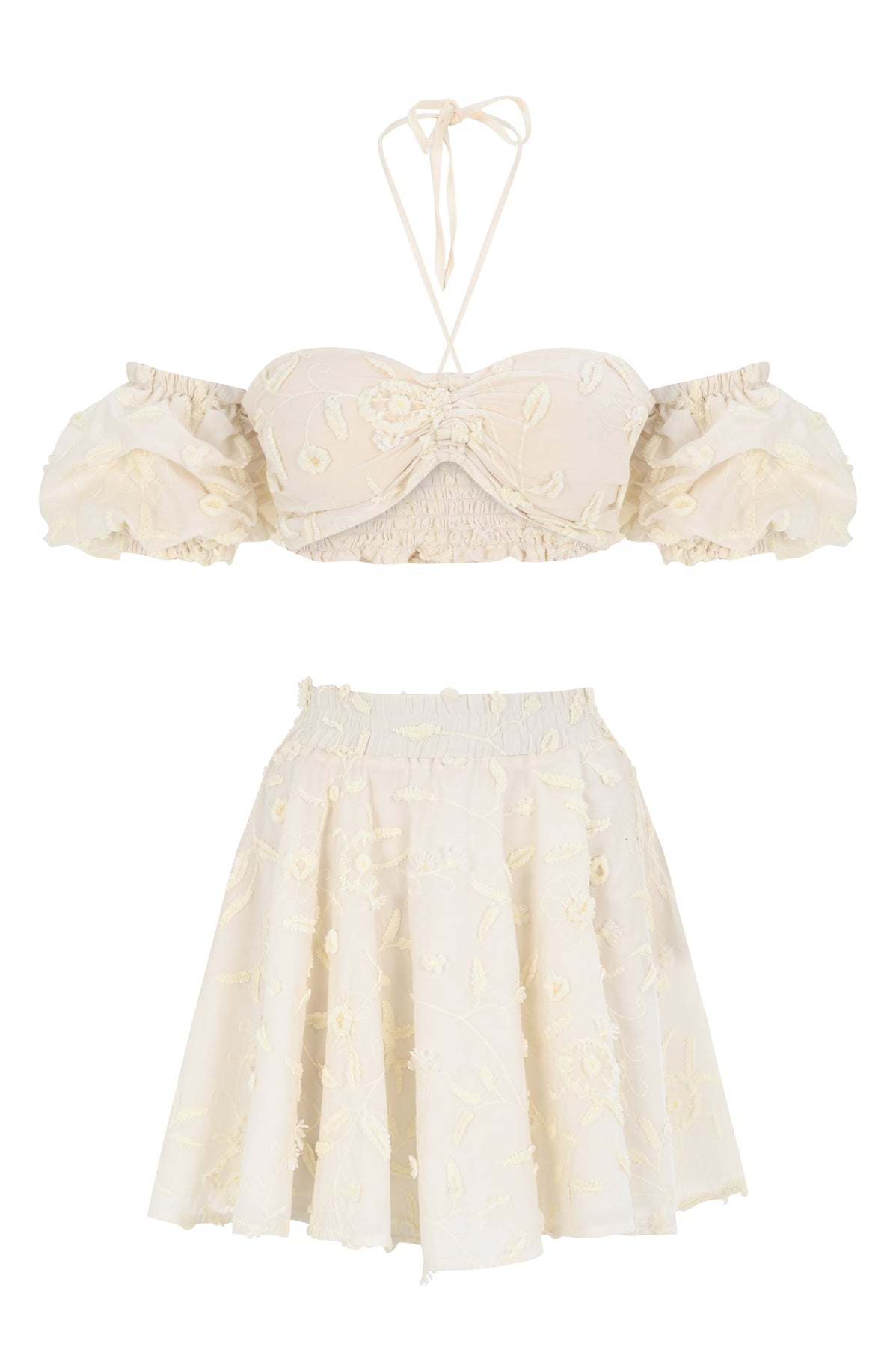 Ürün Açıklaması: Nakışlı ve üç boyutlu işleme detaylı, boyundan bağlamalı, çıkarılabilir kollu, globlu bra ve beli lastikli 100% cotton vual astarlı mini etek takım Kumaş Bilgisi: %55 Polyester %45 Cotton Bakım Önerileri: 30º Max Yıkama Ağartıcı kullanmayın Tamburlu kurutma yapmayın Düşük ısıda ütüleme yapın Kuru temizleme yapılabilir.