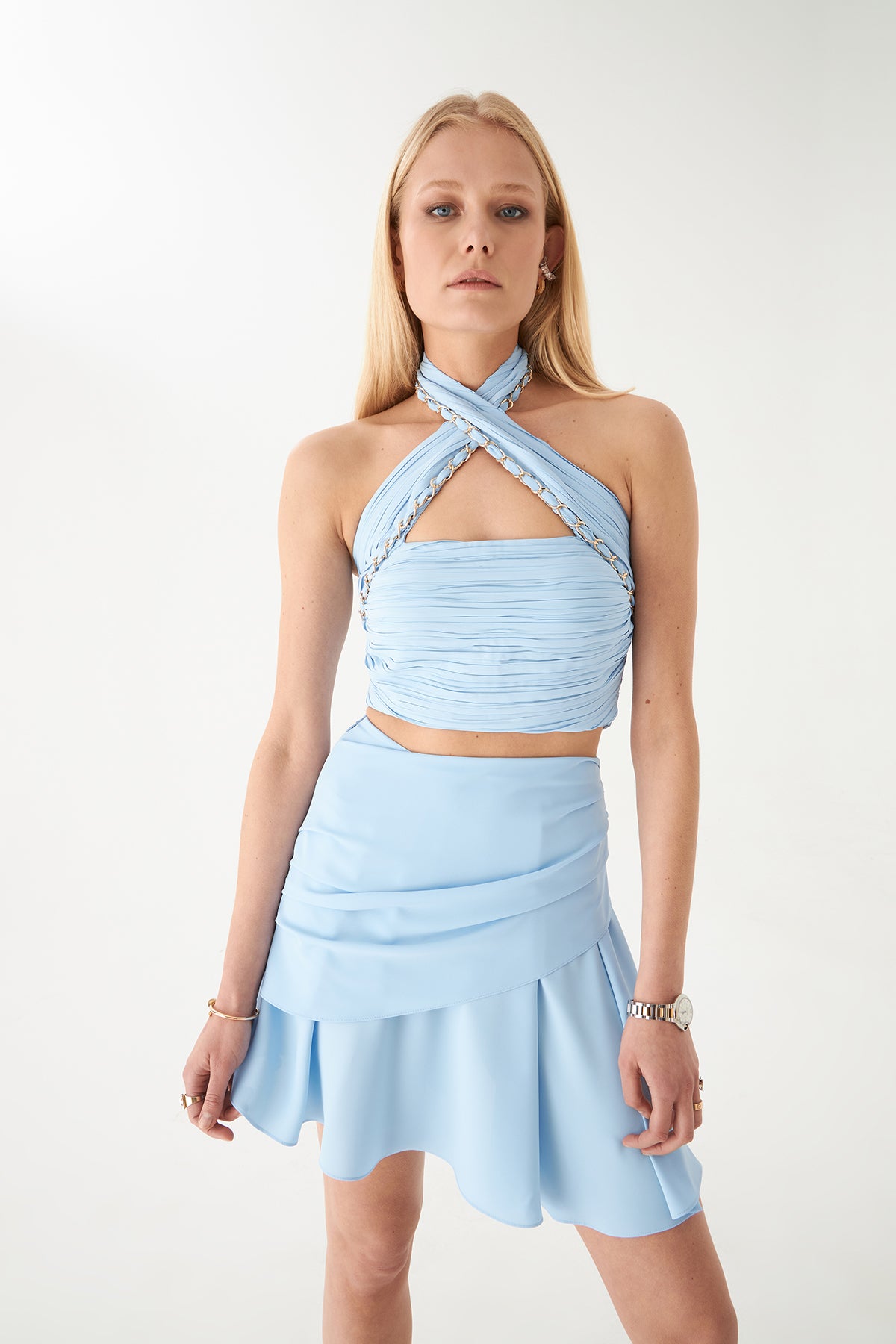 Ürün Açıklaması: Zincir Detaylı, boyundan çapraz geçişli, düğme kapamalı büstiyer Kumaş Bilgisi: %100 Polyester Bakım Önerileri: Sadece kuru temizleme yapınız