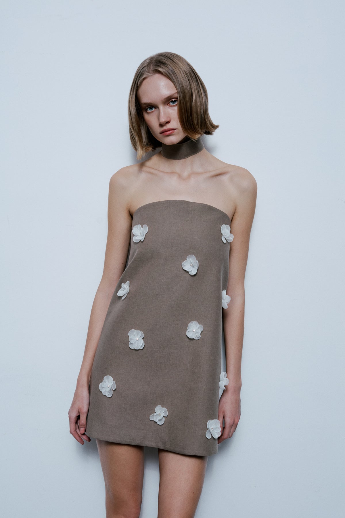 Ürün Açıklaması:Takılıp çıkarılabilir askılı, straplez, el işçiliği taşlı çiçekli aksesuar detaylı, sırt kısmı gizli fermuarlı 100% keten mini elbise Kumaş Bilgisi:%100 Linen Bakım Önerileri: Sadece kuru temizleme yapılabilir.