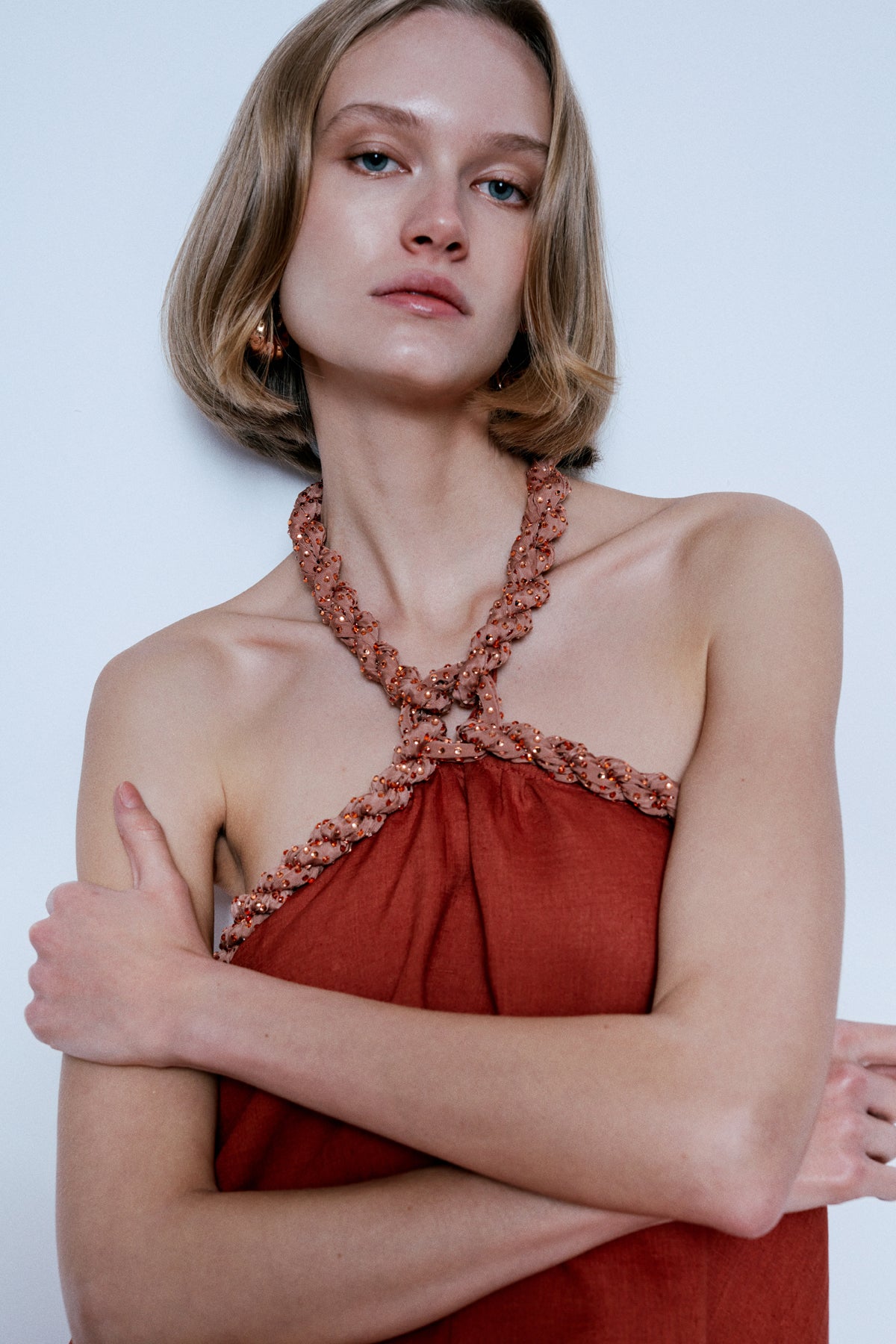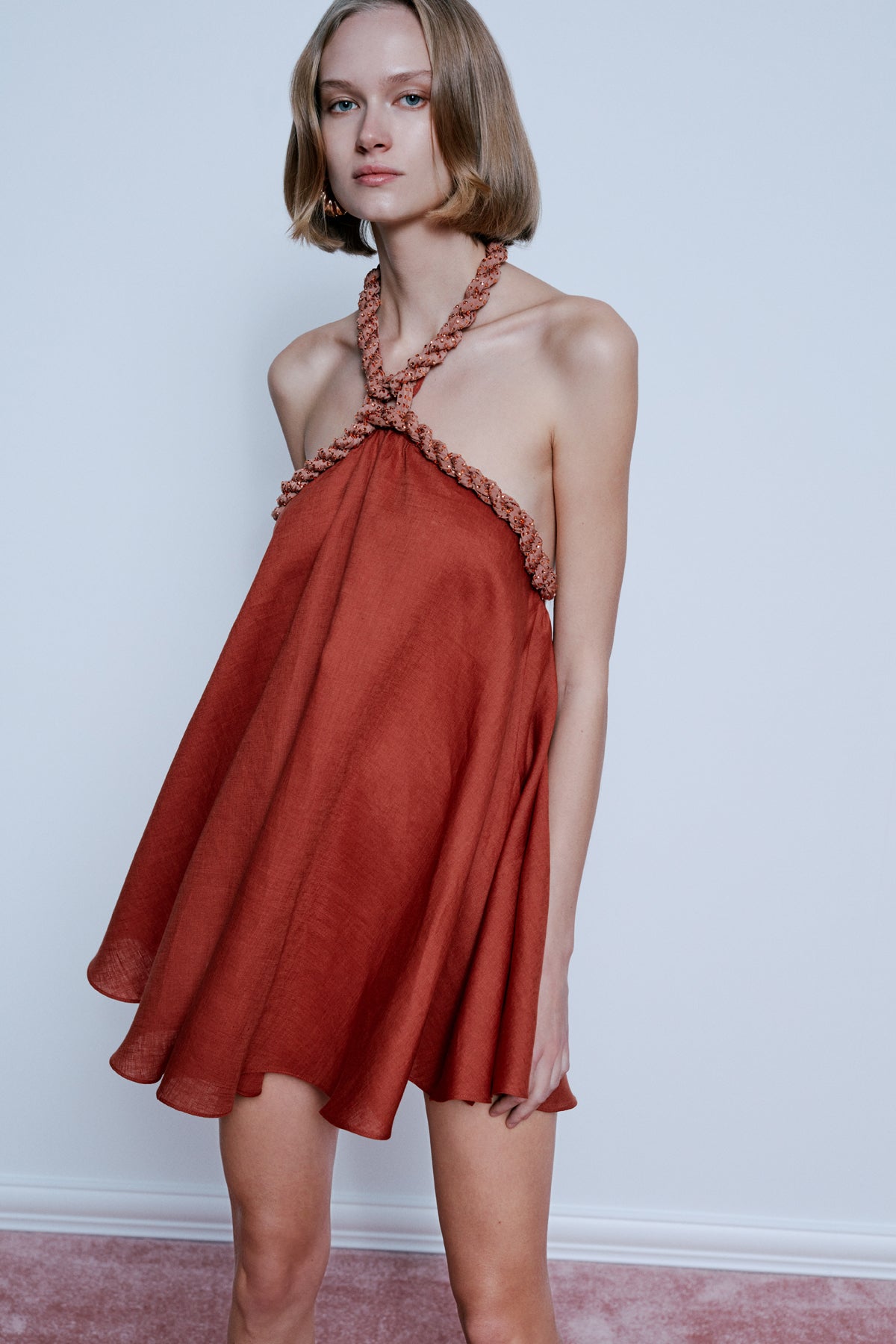 Ürün Açıklaması:Boyundan bağlamalı, taşlı handmade burgu detaylı, sırt kısmı lastikli, etekleri volanlı, astarsız 100% keten over form mini elbise Kumaş Bilgisi:%100 Linen Bakım Önerileri: Sadece kuru temizleme yapılabilir.