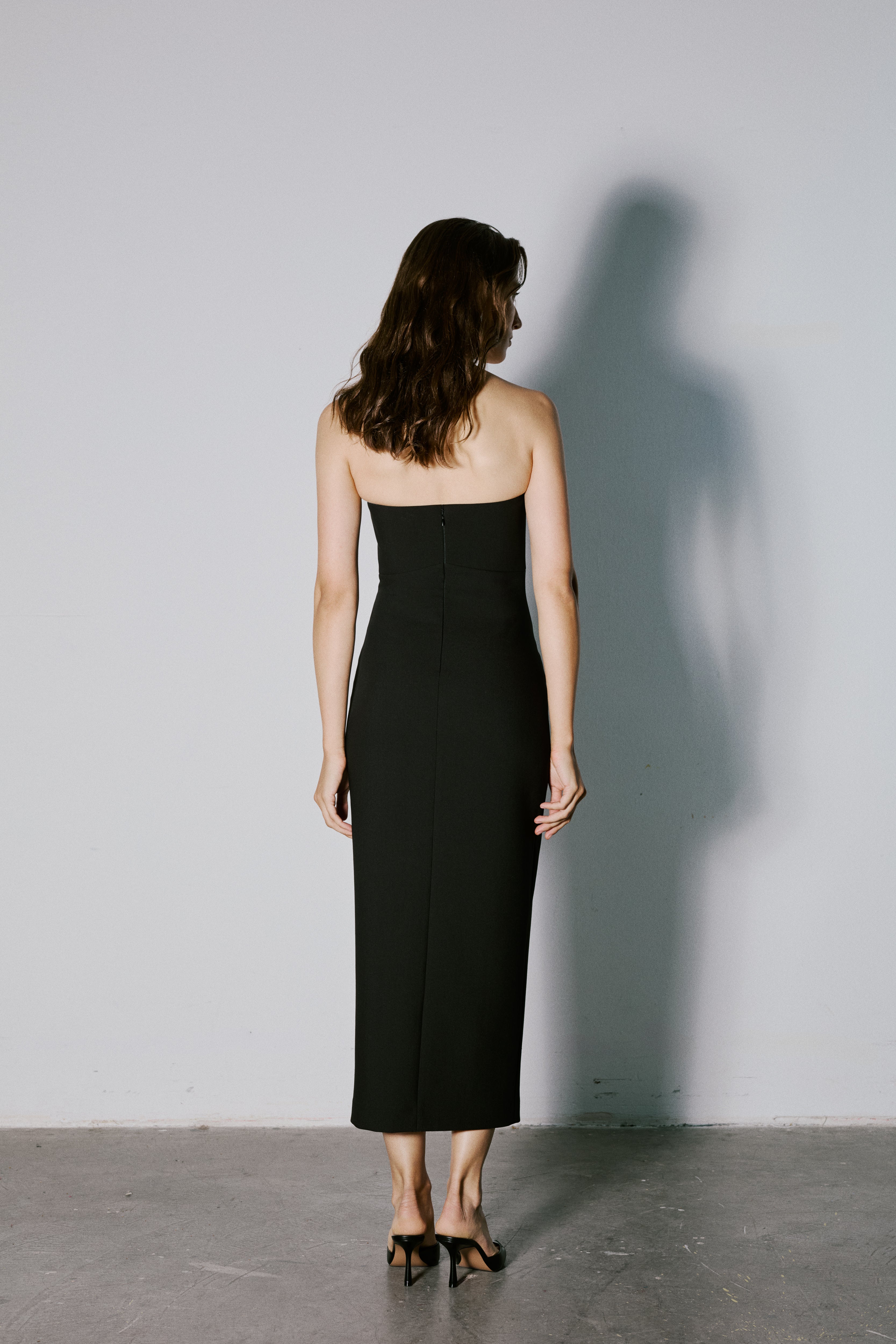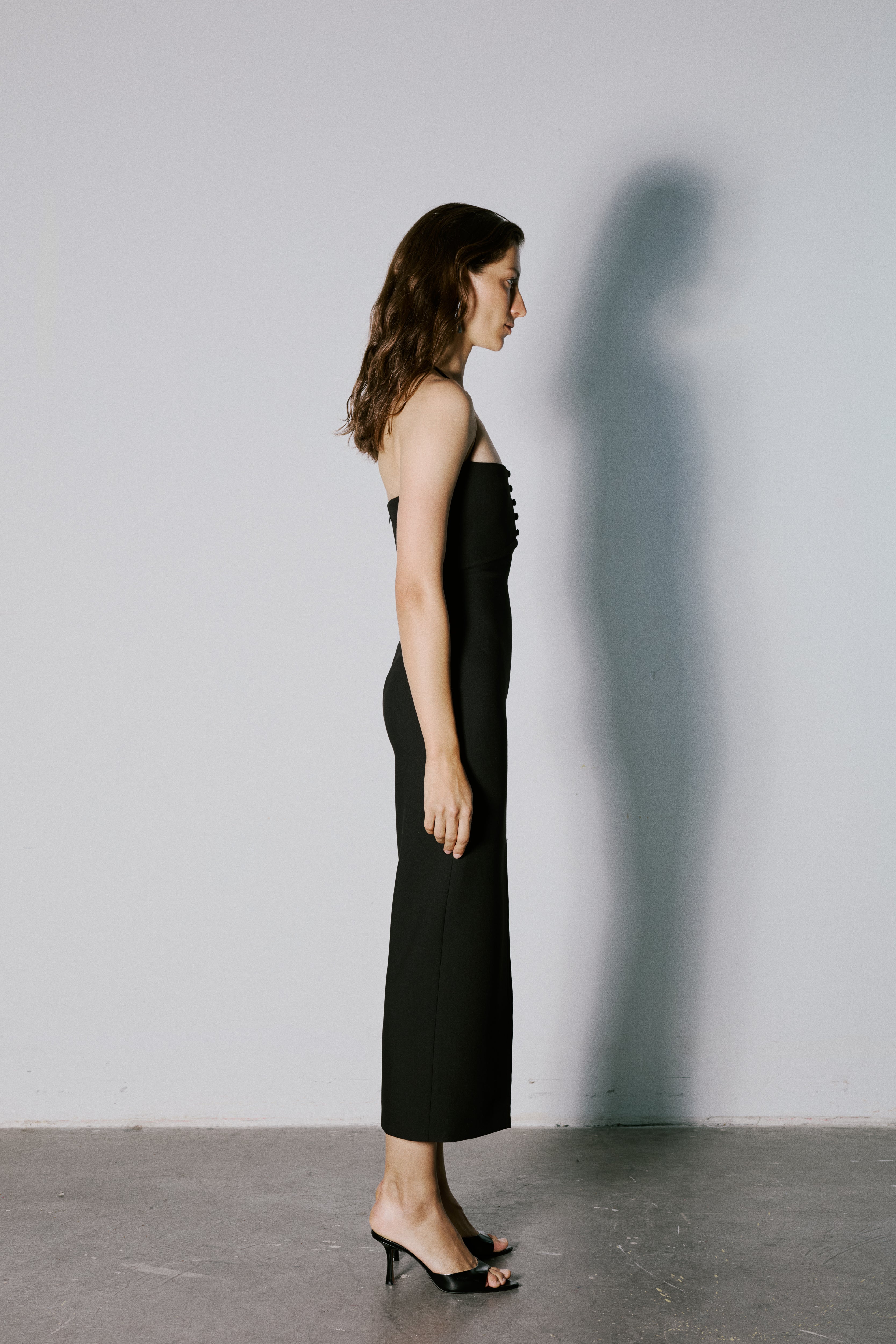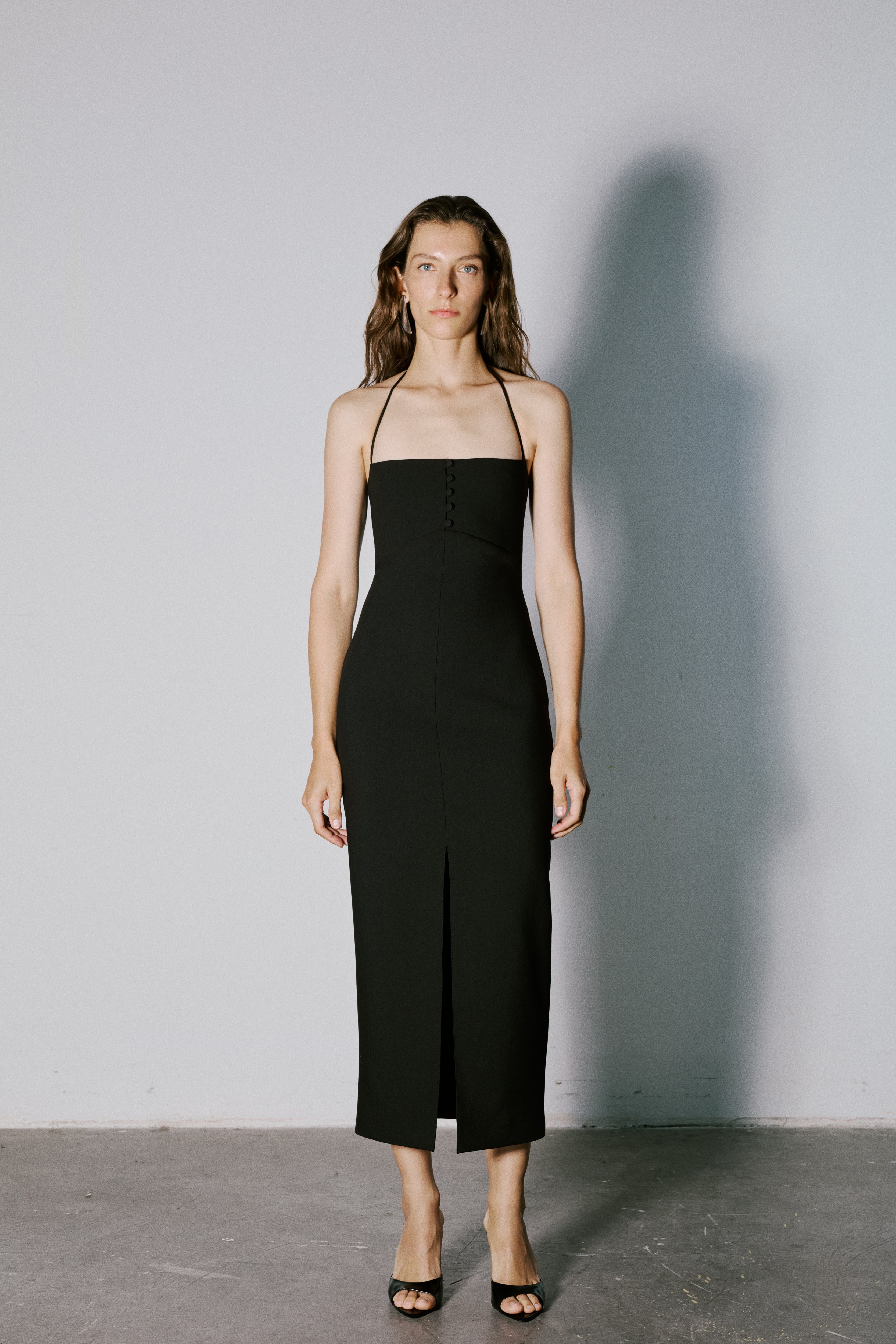 Ürün Açıklaması: Boyundan ince askılı, göğüs kısmı brit detaylı, önden yırtmaçlı uzun elbise