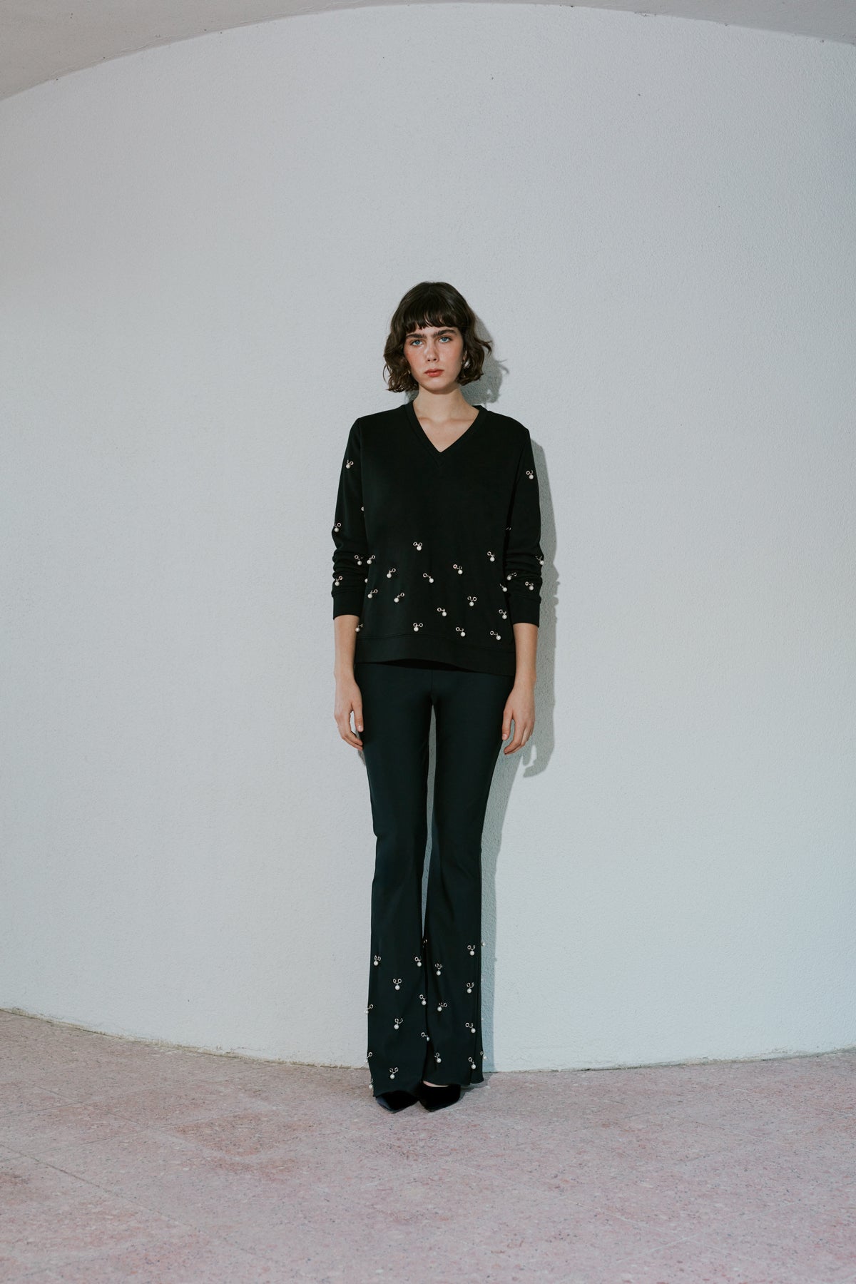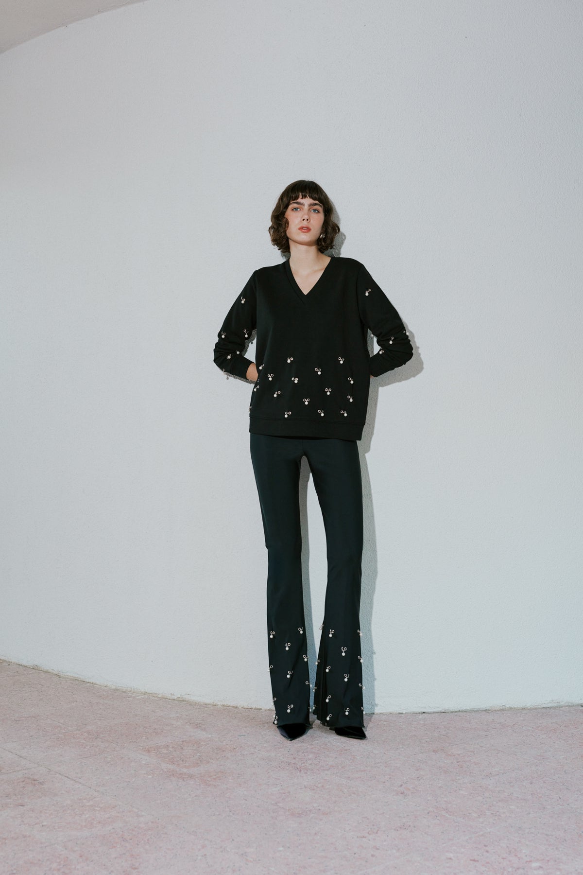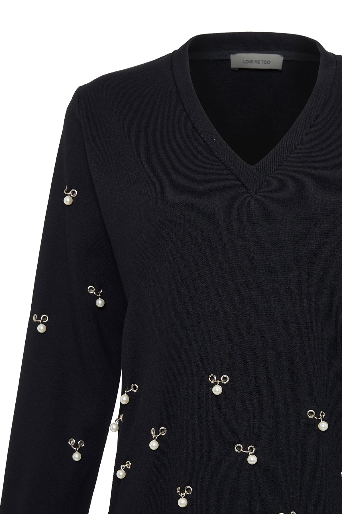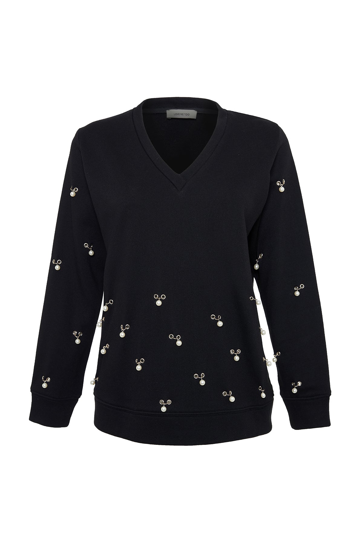 Ürün Açıklaması: Etek uçları ve kolları kuş gözlü ve incili aksesuar detaylı V yaka sweatshirt Kumaş Bilgisi: %100 Cotton Bakım Önerileri: 30º Max Yıkama Tersten yıkayın Ağartıcı kullanmayın Tamburlu kurutma yapmayın Orta ısıda ütüleme yapın Kuru temizleme yapılabilir.