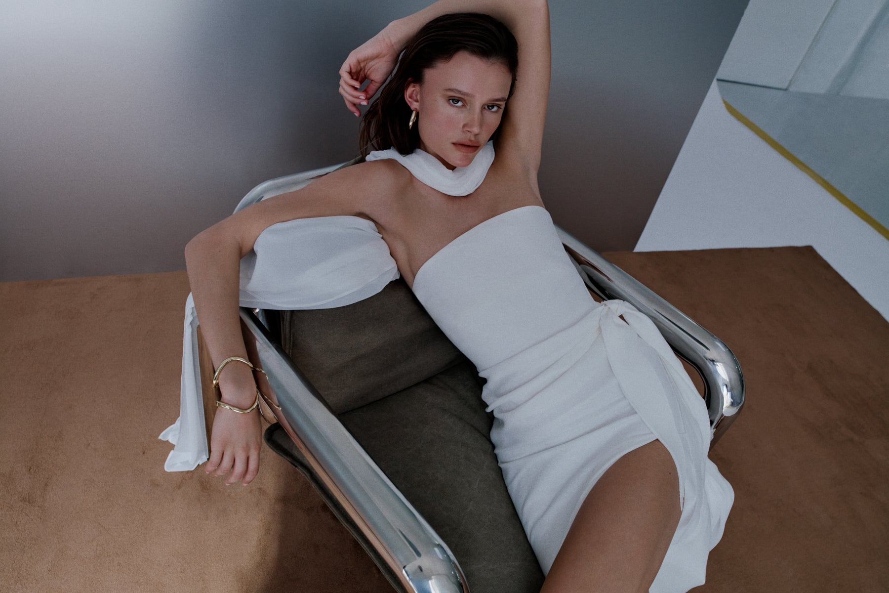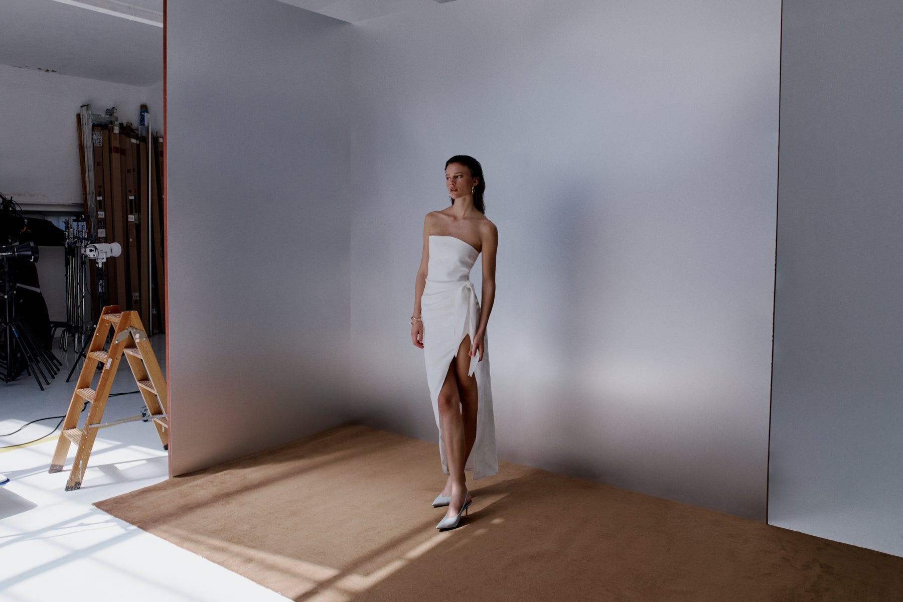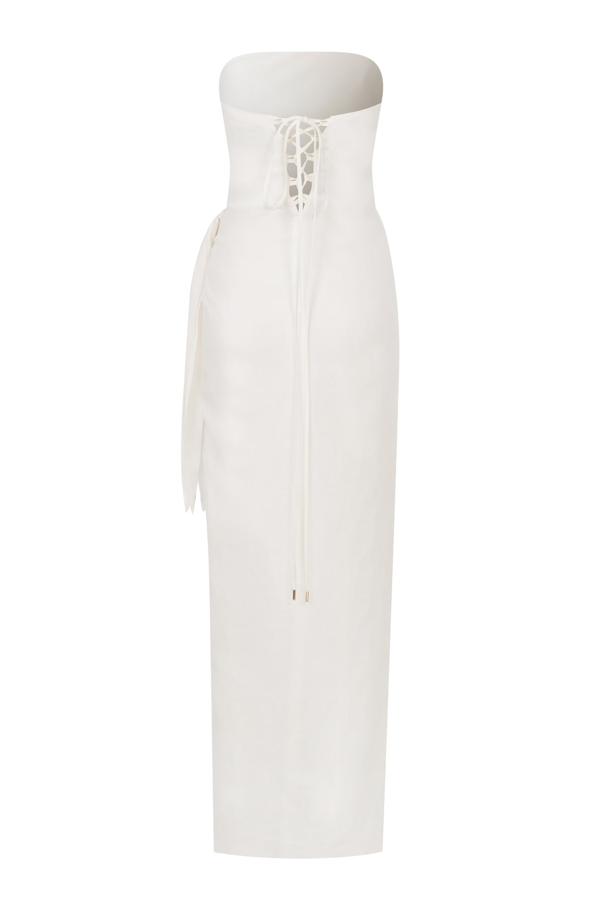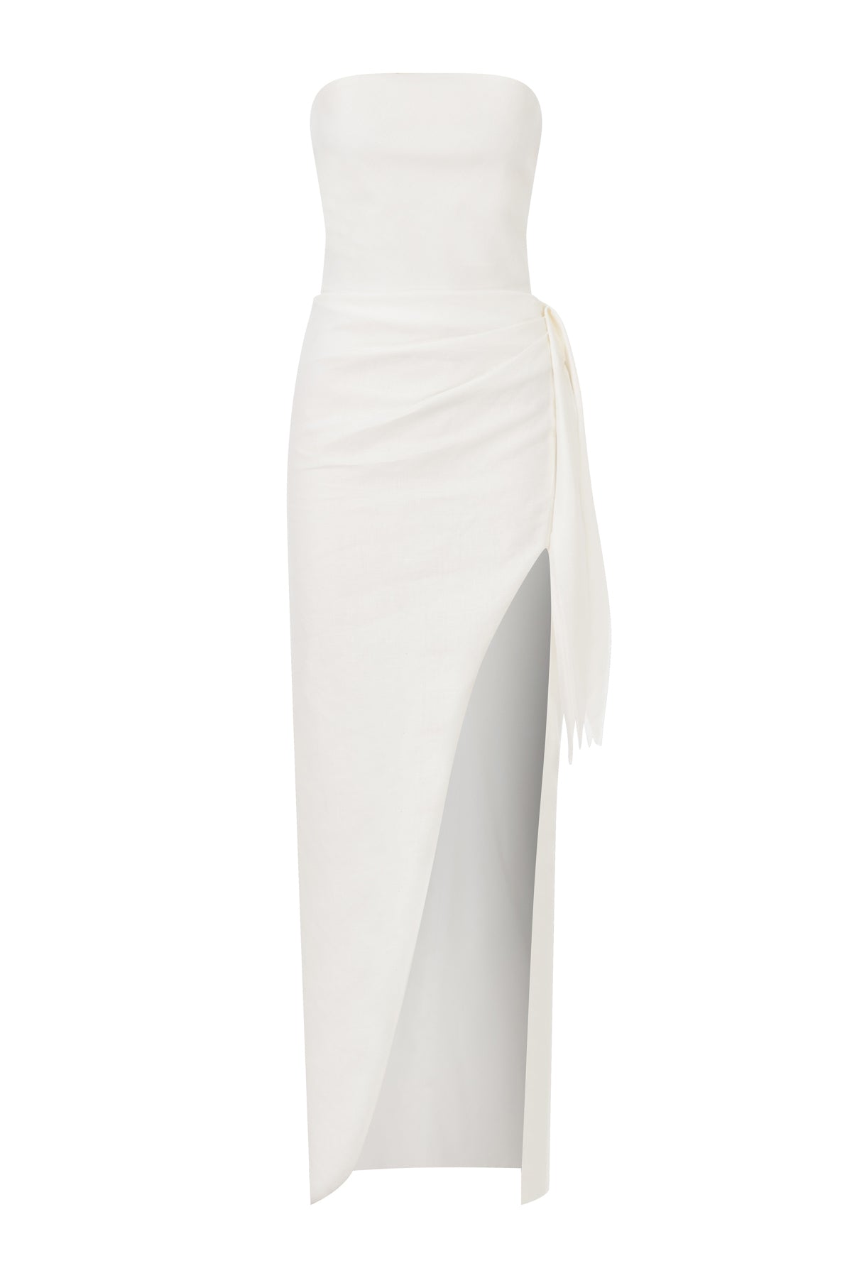 Ürün Açıklaması: Ön straplezi yuvarlak tasarlanmış, sol bacakta derin yırtmaçlı, sol yan belde kendi kumaşından tasarlanmış sabit aksesuar detaylı, üst beden cotton vual astarlı, alt beden astarsız 100% keten uzun elbise