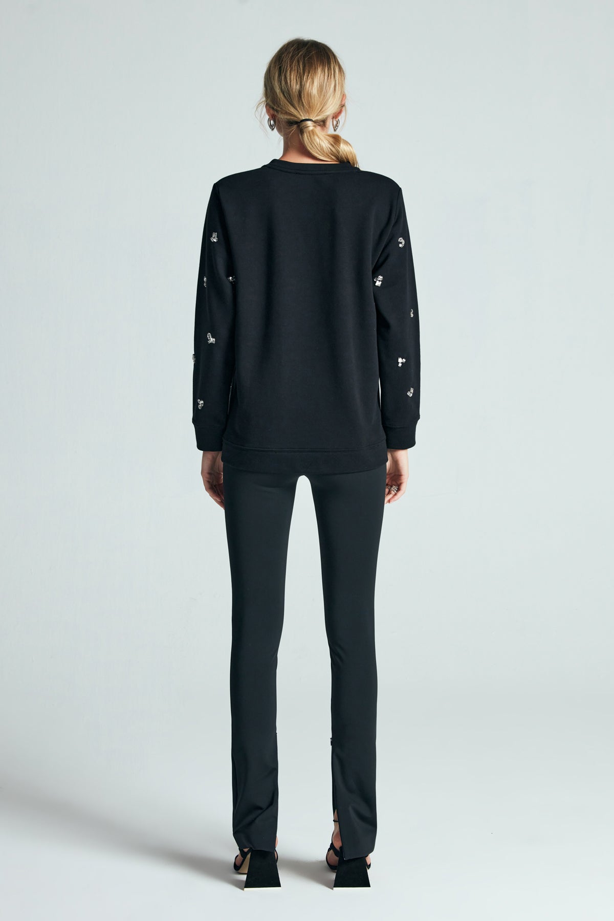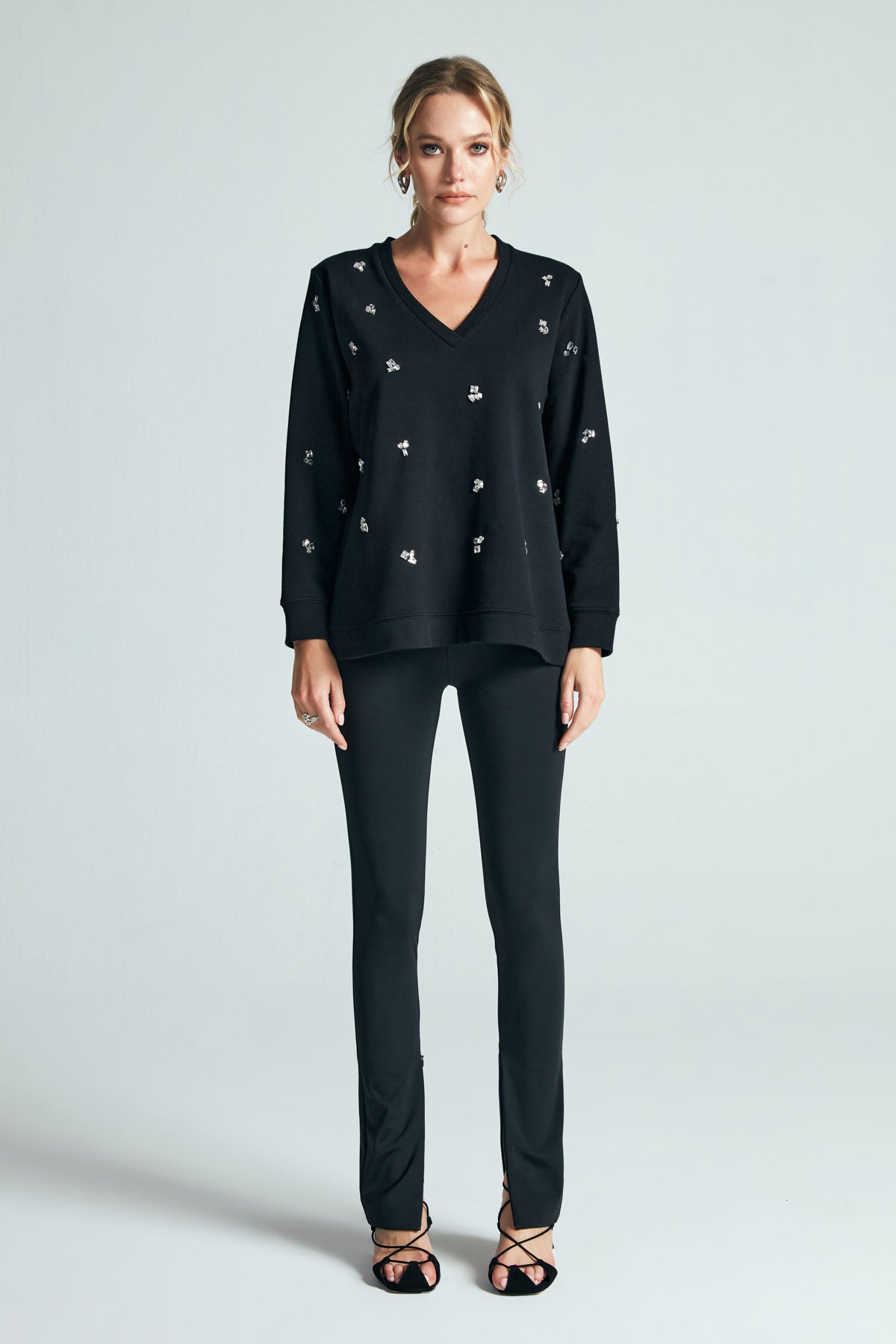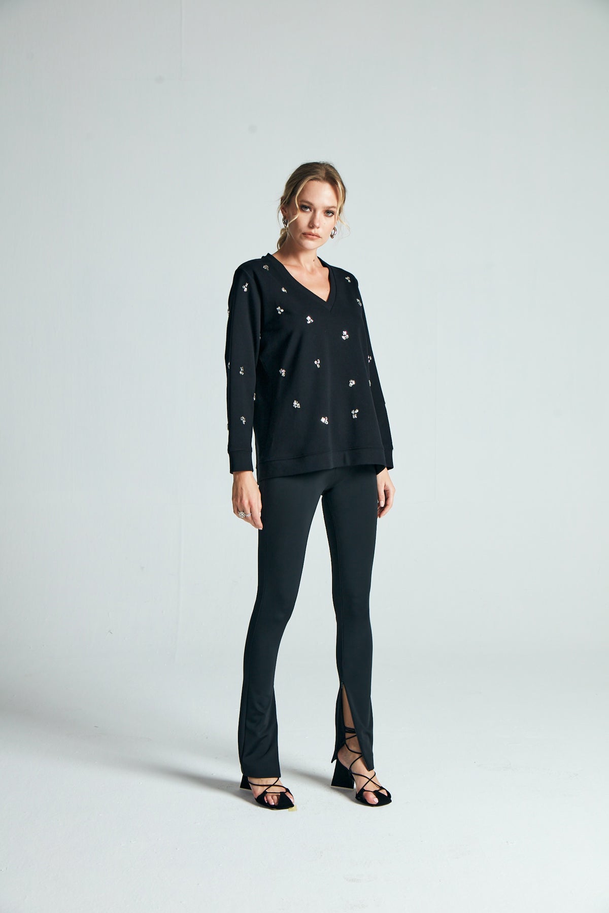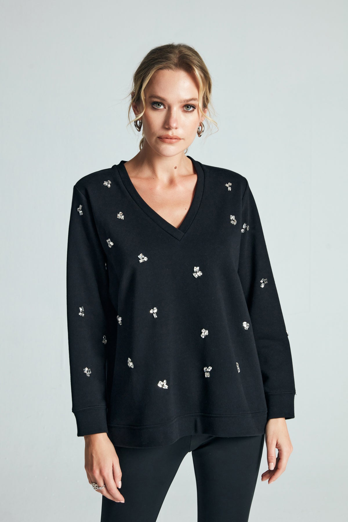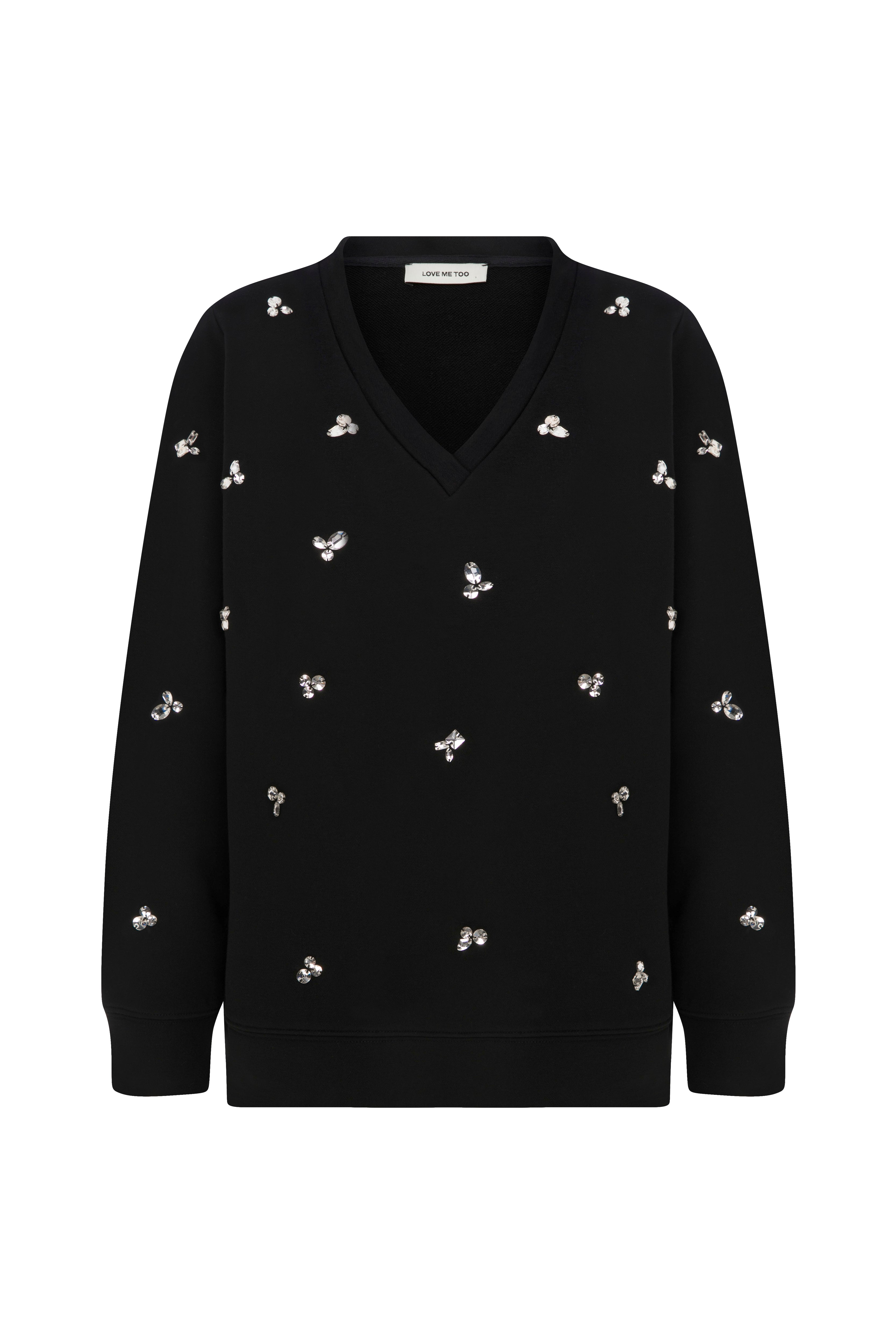 Ürün Açıklaması: Kristal taşlı aksesuar işlemeli V yaka sweatshirt Kumaş Bilgisi: %100 Cotton Bakım Önerileri: 30º Max Yıkama Tersten yıkayın Ağartıcı kullanmayın Tamburlu kurutma yapmayın Orta ısıda ütüleme yapın Kuru temizleme yapılabilir.